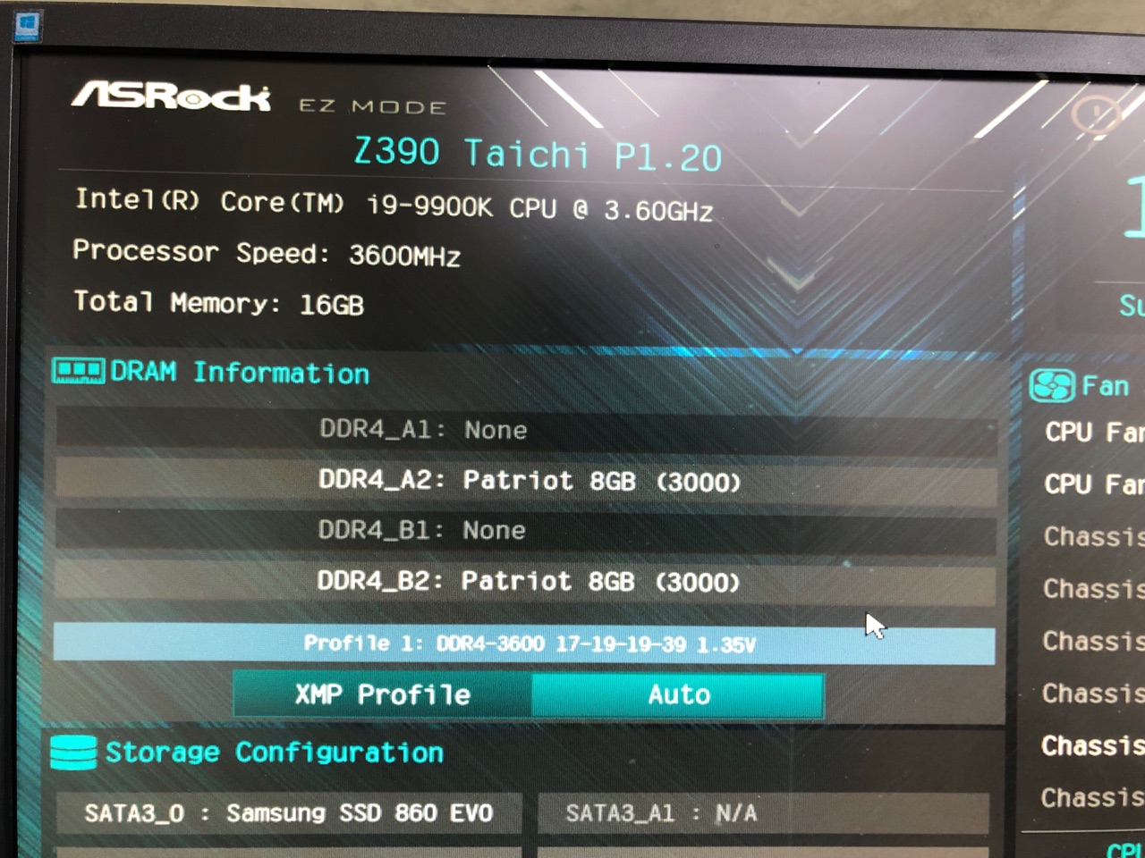 Здравствуйте. Прошу помощи в настройке памяти.. CPU: i9-9900k MB: Asrock z390 taichi Версия BIOS: P1.20 22.08.2018 RAM: PV416G360C7K Ситуация какая. На своих родных 3600 без XMP профиля не запускается вообще (в плане РГБ светятся а монитор не включается), с XMP выдает критическую ошибку про память. Стабильно компьютер работает только на 3000 в режиме АВТО. Хочется хотя бы 3600-4000 а больше мне и не нужно.