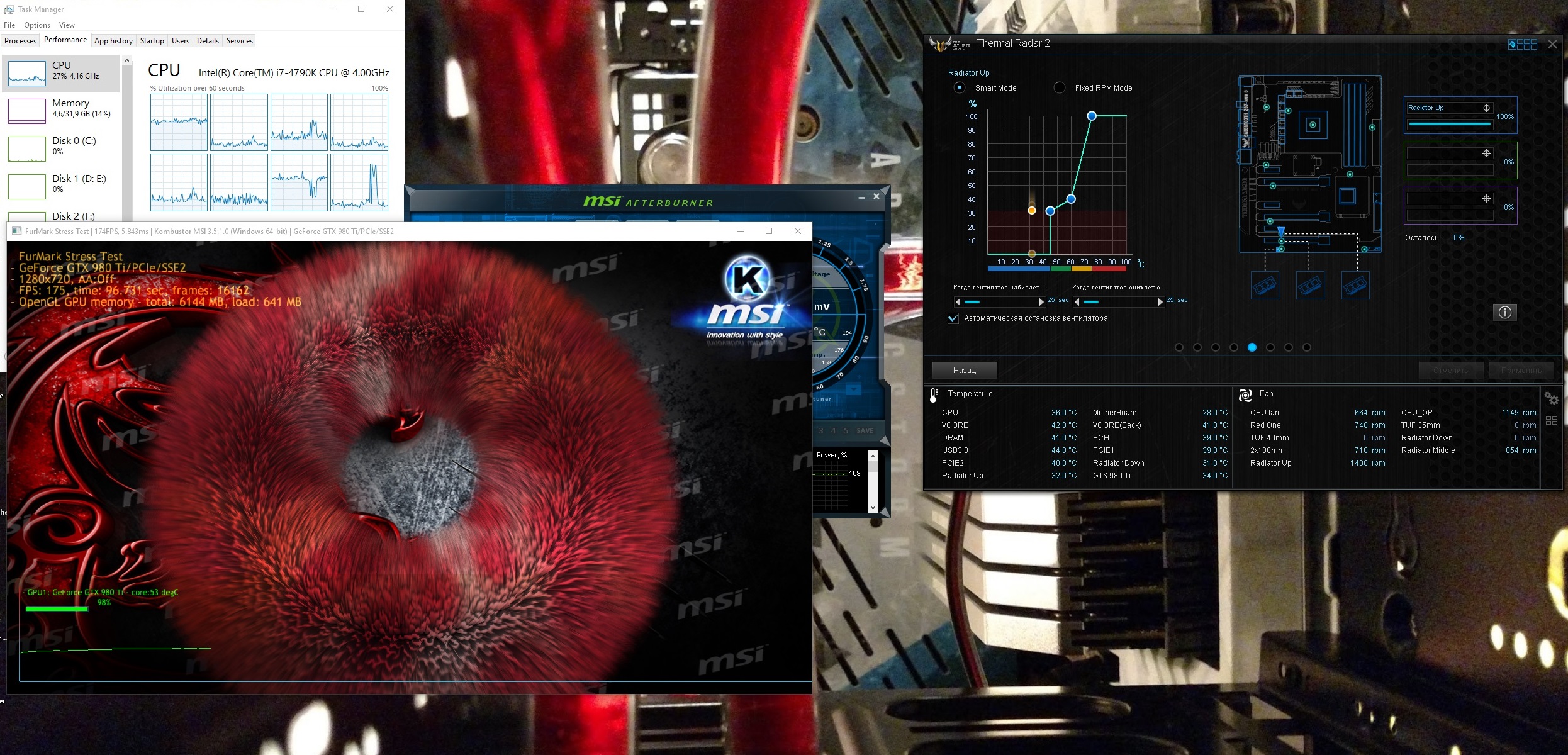 Товарищи оверы! - нужен ваш совет относительно Sabertooth z97. В частности - относительно управления охлаждением: в thermal radar настроил работу СО на включение при 45 градусах (разные вентиляторы от разных датчиков, в thermal radar установлено соответствие конкретного датчика конкретному кулеру) и при достижении этой температуры все работает согласно построенному графику. НО! при температурах ниже 45 периодически начинают работать все кулеры, причем частота их вращения пропорциональна нагрузке на процессор (именно нагрузке, температура не изменяется или изменяется незначительно).