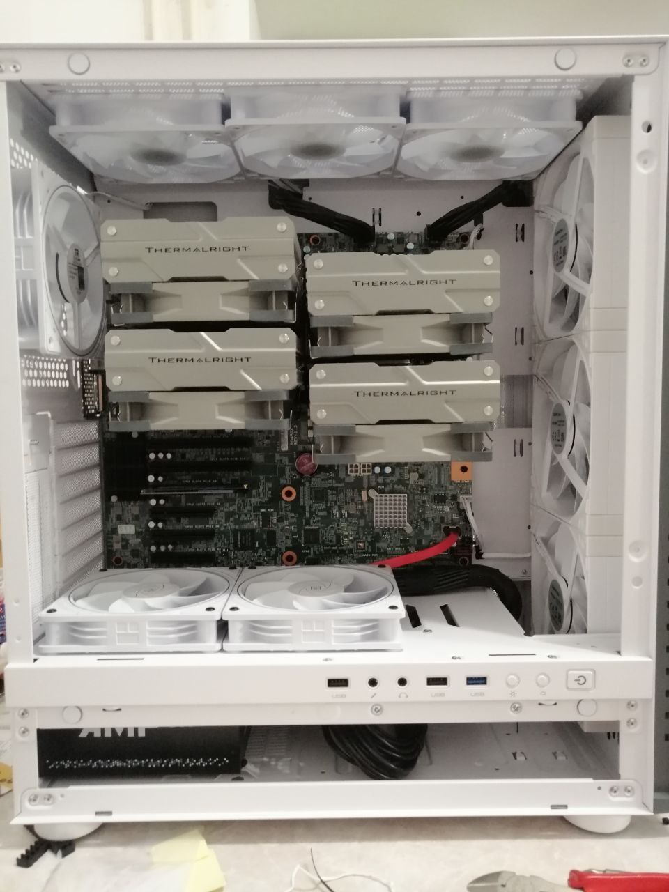 кулеры выбрал побольше, потому что было место, пришлось колхозить амд "рамки" но очень не хотелось пластмассовые "прямоугольные" рамки ставить и на них кулеры.