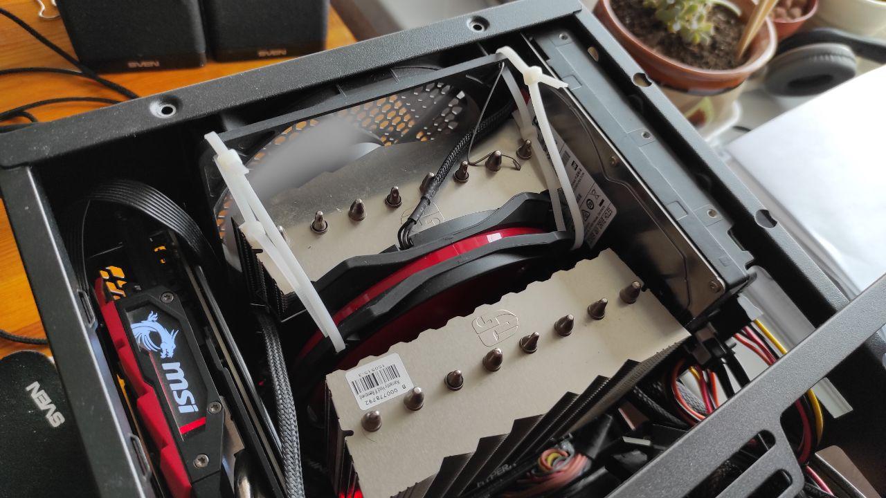 после сборки и запуска в стресс тесте заметил что температура на НЕ ПАРНЫХ ядрах выше на 15 °С стало ясно что кулер жмёт не равномерно на чип, придумал ограничить положение кулера пружинящей металлической скобой в одном направлении и пластиковыми стяжками в другом чтоб удержать процессор в нужном положении, что стабилизировало температуры до дельты в 3-5 градусов (настройки системы охлаждения - сток):