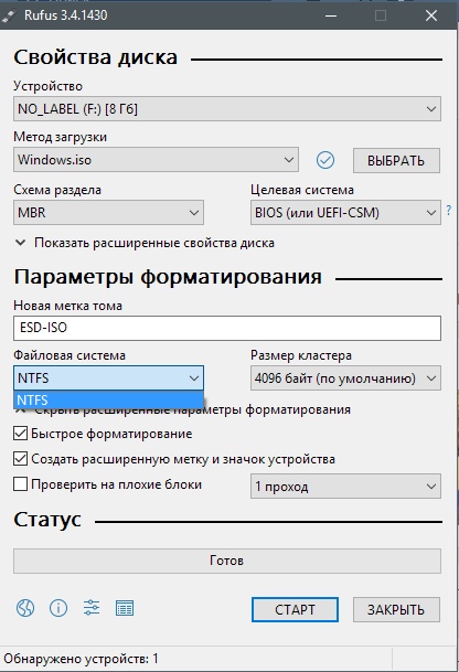 В руфусе MBR или GPT (у MBR 2 варианта, с BIOS или UEFI-CSM и просто с UEFI), и еще при выборе образа с виндой, руфус сам выставляет NTFS, а не FAT32 нужна ли? Добавлю, руфус 2.8 ставит NTFS, 3.4 - FAT32 не знаю кому верить прям