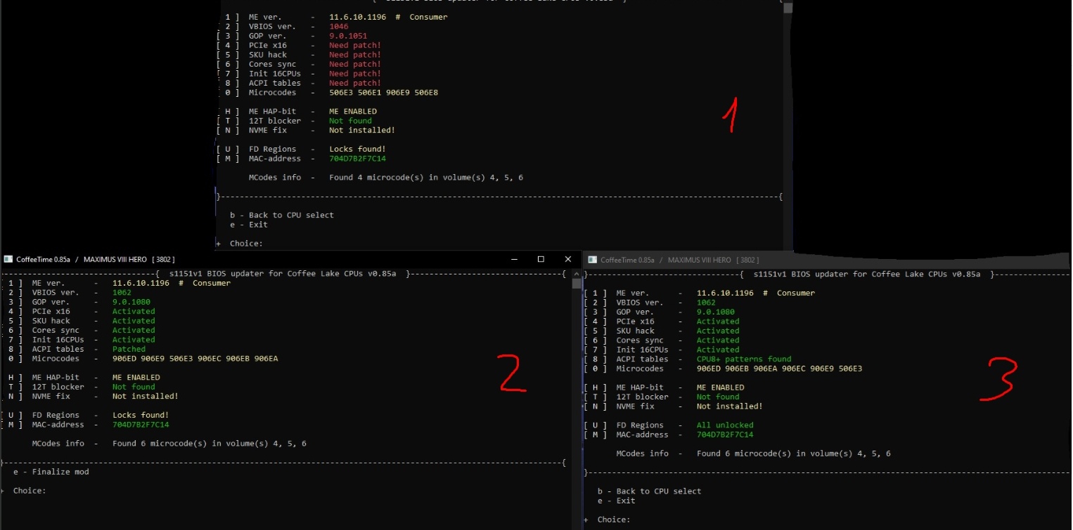 Вообщем готовлюсь к кофемоду и есть небольшой вопрос. Какой из биосов лучше оставить? 1- это дефолтный биос который стоит сейчас, а разница между 2 и 3 в FD Regions и ACPI tables. Какие значения в этих полях лучше оставить? Планирую прошивать сначала через ASUS Flashback поэтому и спрашиваю. И ведь после прошивки биоса для использования проца Skylake не нужно пинмода? Материнка- Asus M8H. версия биос- 3802 Заранее спасибо)