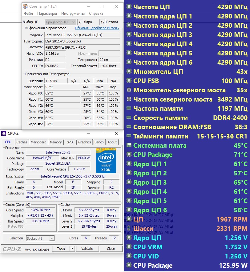 Для разгона множитилем как правило достаточно настроек стокового биоса, но в любом случае не прошивайте биосы предназначеные для анлока турбобуста процессров с заблокированым множителем, типа"с повышенным повер-лимитом и открытыми дополнительными настройками QPI". Для плат Huananzhi и других, использующих схожий биос, нужные настройки находятся в меню IntelRCSetup > Overclocking Feature > Processor и IntelRCSetup > Overclocking Feature > CLR\Ring. Основные параметры: Core Max OC Ratio — множитель ядер. Для Xeon E5 1650 v3 можно сразу установить 41-42. Core Voltage Mode — можно выбрать динамически (Adaptive) повышать напряжение или сделать статическим Core Voltage Override — выставляем напряжение на процессор в милливольтах, к примеру 1250, это будет 1.25 вольта (начать можно как раз с этого значения). Выше 1.30 поднимать с осторожностью! CLR Max OC Ratio — множитель контроллера памяти. По умолчанию равен 30, можно плавно повышать до 33-35 и тестировать производительность и стабильность. Core Voltage Mode — напряжение контроллера памяти. Аналогично Core Voltage Mode, но не выше 1250. Процессоры Haswell очень чувствительны к напряжению контроллера памяти, более-менее оптимальным считается 1.25 вольта, поднимать выше стоит с особой осторожностью.