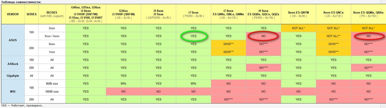 * — Для многих «топовых» плат 100 серии (например Maximus VIII серия, Z170-Deluxe, Z170-A) отключение МЕ на 2xxx биосах (для запуска Xeon) приводит к неработоспособности системы. Решение: Не найдено. ** — На некоторых платах 100 серии (например M8F, M8HA, Z170-A, Z170-AR, H170-ProGaming, Z170-ProGaming) на 3ххх биосах при установке 12-ти поточных зионов встречается one_boot_bug — однократный удачный запуск и неработоспособность в дальнейшем. Решение: Использовать 2ххх версию биоса. *** — Некоторые 200 платы (например ROG серия Z270, Z270-A) могут работать с 12-ти поточными процессорами на 0ххх версиях биоса. На части плат (например Z270-P, Z270-Dragon) запуску 12-ти поточников помогает удаление модуля «12T_blocker» (терминология CoffeeTime, GUID=64BEA199-7C6C-4F51-B0DA-F42C897DA5CC), если он есть в биосе. Зависимость результатов пока не определена, нужно тестировать для каждой конкретной платы. Решение: Использовать порт-биос от совместимой Z370 платы. **** — Для большинства плат 200 серии можно портировать биос от совместимой Z370 материнки, если такая существует. Удачный исход позволит запускать на ней все Coffee Lake процессоры. Метод применим и для не-Z материнок.