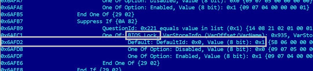 Добавлено спустя 30 минут 20 секунд: И последнее. Если я правильно понял, то для временного снятия 'NIOS Lock' мы юзаем в AMISetupWriter оффсет 'Default' со значением 0х0