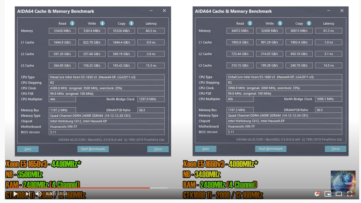 А вот результат от ANDRIKSTORM разгона DDR3 ECC REG Samsung M393B1K70DH0-CK0 1600, также разогнанной до 2133 и которую также у нас на вторичке 32 Гб (4x8) можно купить за $45-48. #77 Даже если на DDR4 удастся понизить тайминги и обогнать мою DDR3 на пару процентов переплата за нее явно не стоит тех денег. Хотя на процессорах с разблокированым множителем можно добится хороших результатов с DDR4 как в этом видео от Технопланеты