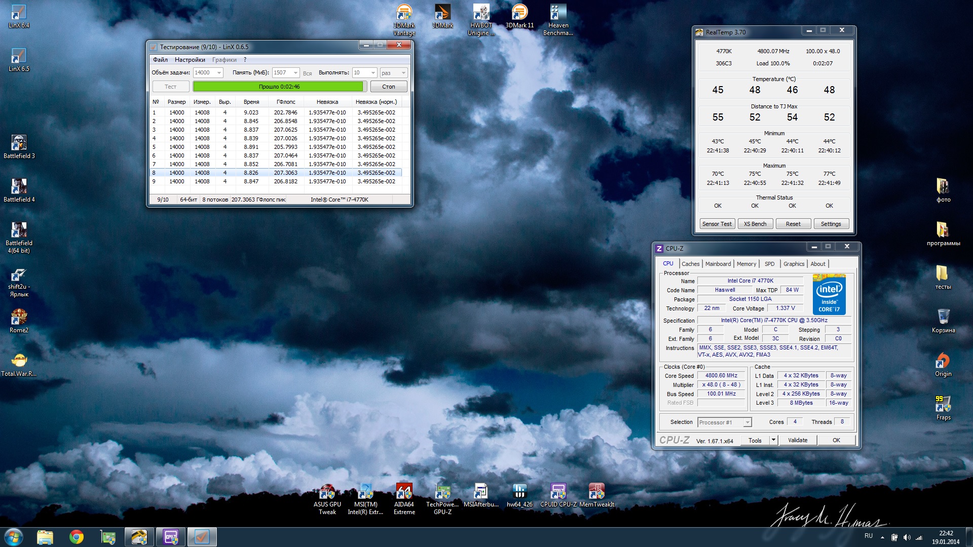 прогнал на скорую руку. решил попробовать. впринцепи и 6.4 хватало для проверки стабильности. но там задачу наааамного больше ставил. система номер 2 из профиля [CPU]: Intel Core i7 4770K @ 4800мгц Vcore=1.335V, VRIN= 1.825V жм-6 [RAM]: 2x4 GB Geil Evo TWO 2133mhz 10 -11-11-30 1.65в @ 2666 11-13-13-31 1т 1.65v [Motherboard]: MSI Z87 Mpower MAX