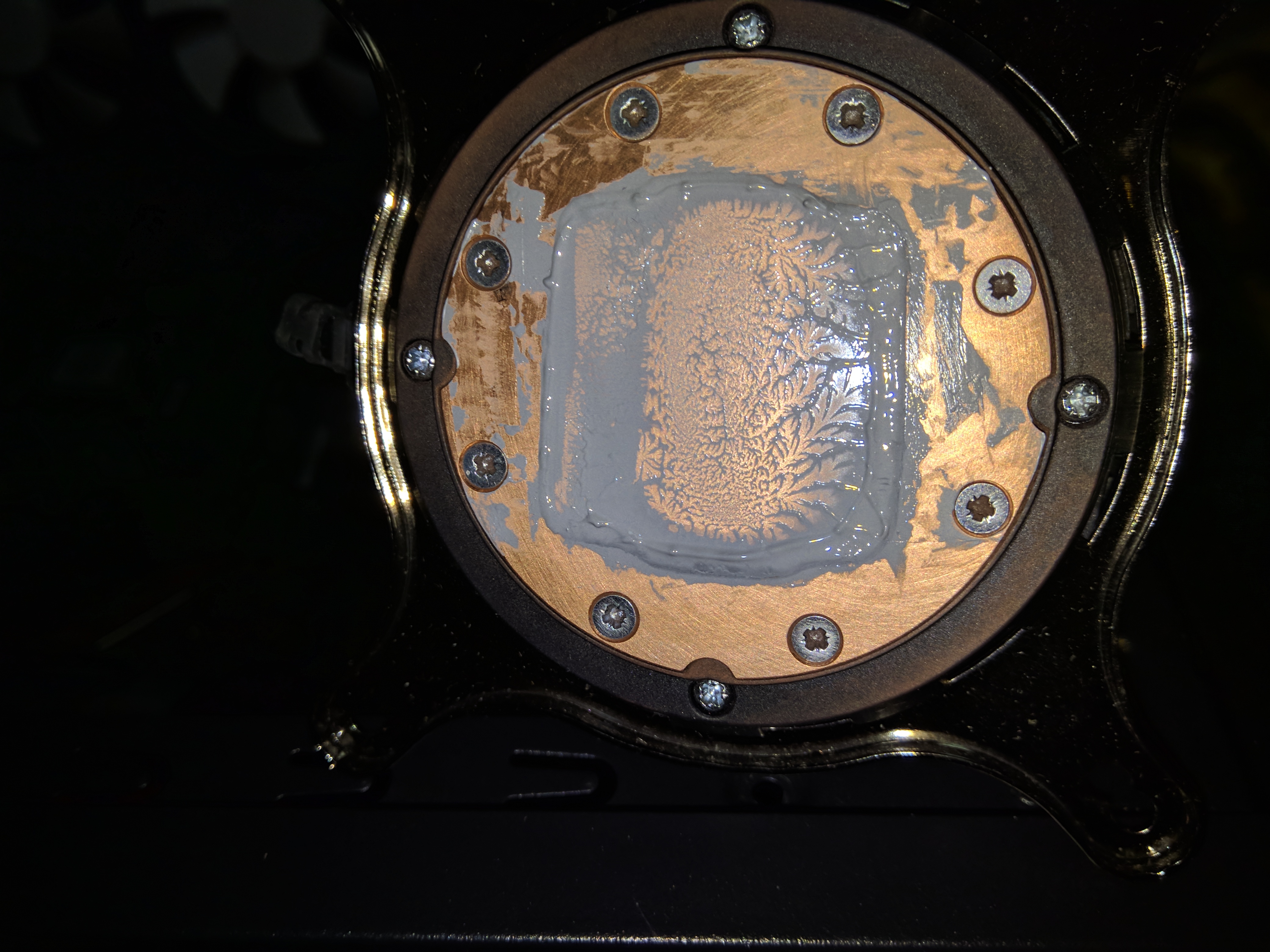В общем, скальпанул второй раз за неделю. После снятия водоблока стало видно, что имеется более-менее нормальный прижим по центру, но по краям - не очень, а в целом пойдет, не должно быть такого разбега по температурам из-за этого. Ну а под крышкой уже вскрылся косячок - пустое место на кристалле. Пришлось провести всю процедуру заново. Как оказалось после чистки, жм уже в кристалле прочно засел и образовал какую-то муть, как и в крышке. Но так и должно быть, насколько я знаю.Ну и по факту повторно проведенного скальпа, можно наблюдать выравнивание температур в нагрузке :