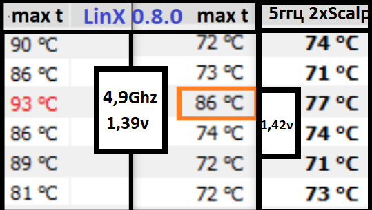 Давно тему не читал, иначе я вам бы сразу посоветовал скальпировать повторно. У меня было даже интересней.. Процессор работающий на 5.2 в одной плате, переставлял в другу (из тайчи в херо) и он вдруг еле работал на 5.0 на критических температурах. Я естественно решил поначалу на матплату, водоблок.. да на что угодно. Но вернуть температуры на место удалось только повторным скальпом. Такая ситуация повторялась дважды. Признаки те же - одно ядро скачет по температурам уж очень сильно - 10-15 градусов от среднего уровня (под нагрузкой конечно).. Я конечно могу ошибаться, но у меня сложилось впечатление, что в этих процах 8-й серии может такое случатся, что после снятия нагрузки с крышки, когда мы снимает/переставляем процессор, нарушается структура нанесенного жм.