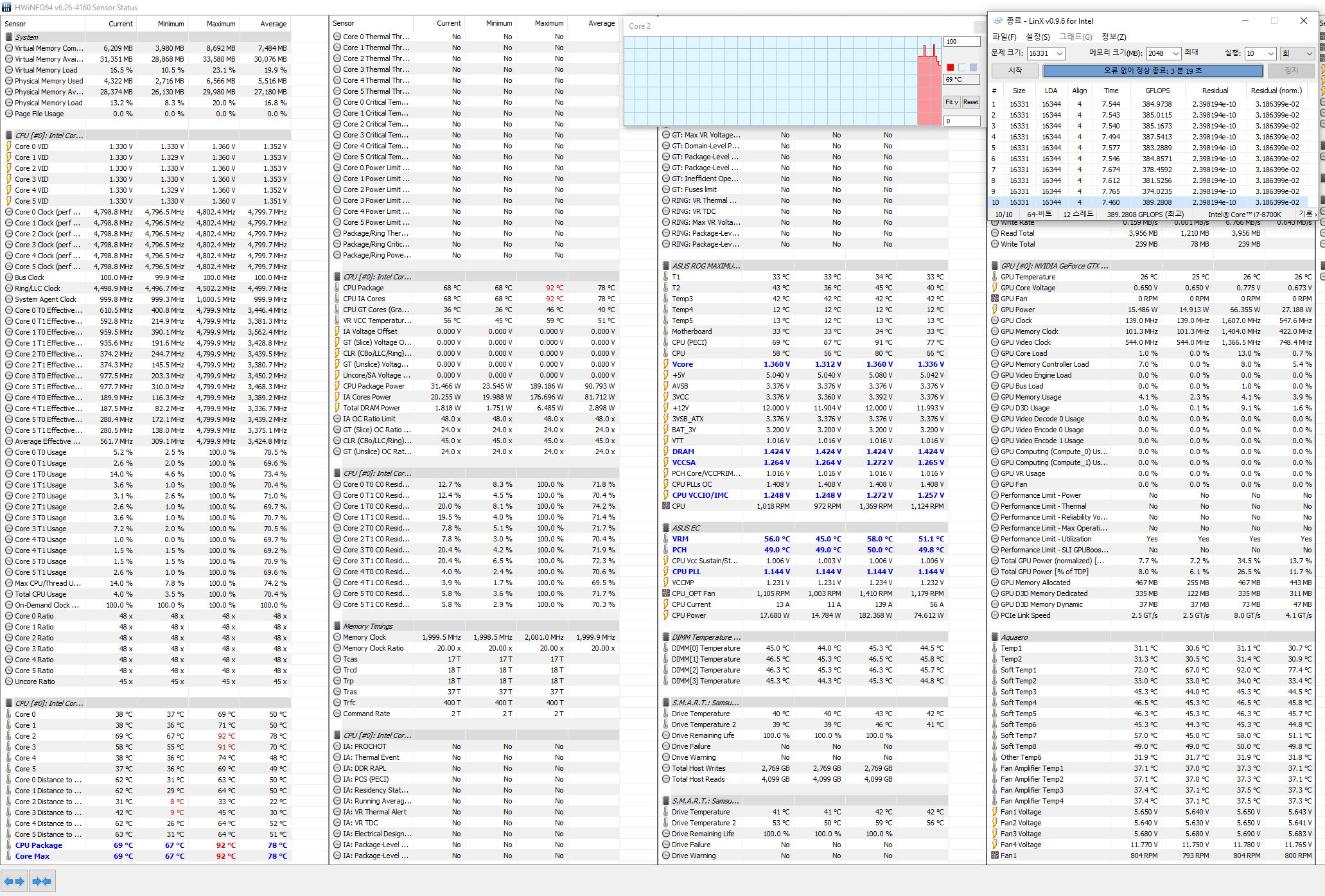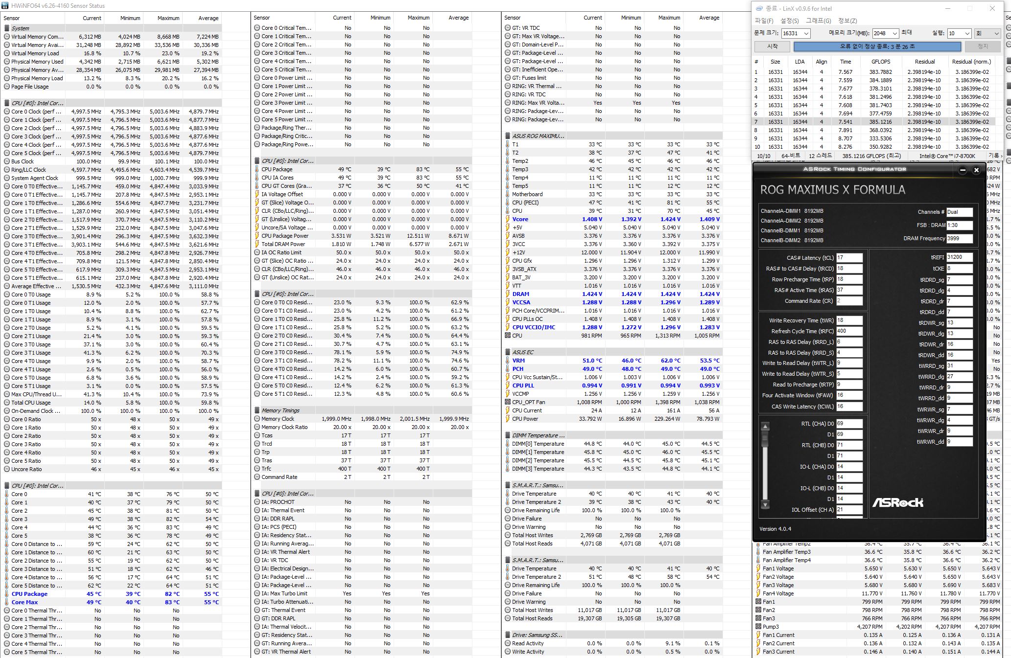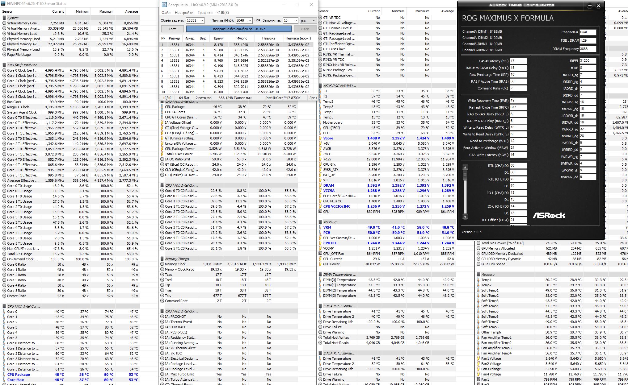 Сьездил на дачу, поел бургеров, на мотоцикле голову проветрил... Подумал, что если с M2.2 портом что - надо ковырять дележку каналов. Выяснил что PCIEX4_3 делит линии с PCIEX1_3 - а у меня во втором звуковуха. Переткнул ее в PCIEX1_3 - все вернулось в нормальный режим. Потом аккуратно начал разгонять. Сначала базовые настройки биоса, потом память в два шага, потом процессор в два шага. Вроде все в норме. Заморочился с разгоном памяти и процессора. Процессор буду подбивать после памяти, он у меня инвалидный, так что пока оставил на 1.4В 5Ghz AVX-2. Память видимо 4000 берет уже с напрягом т.к. невязки в линксе. Чуть сбросил напряжение ей и частоту. Невязки проскакивают.