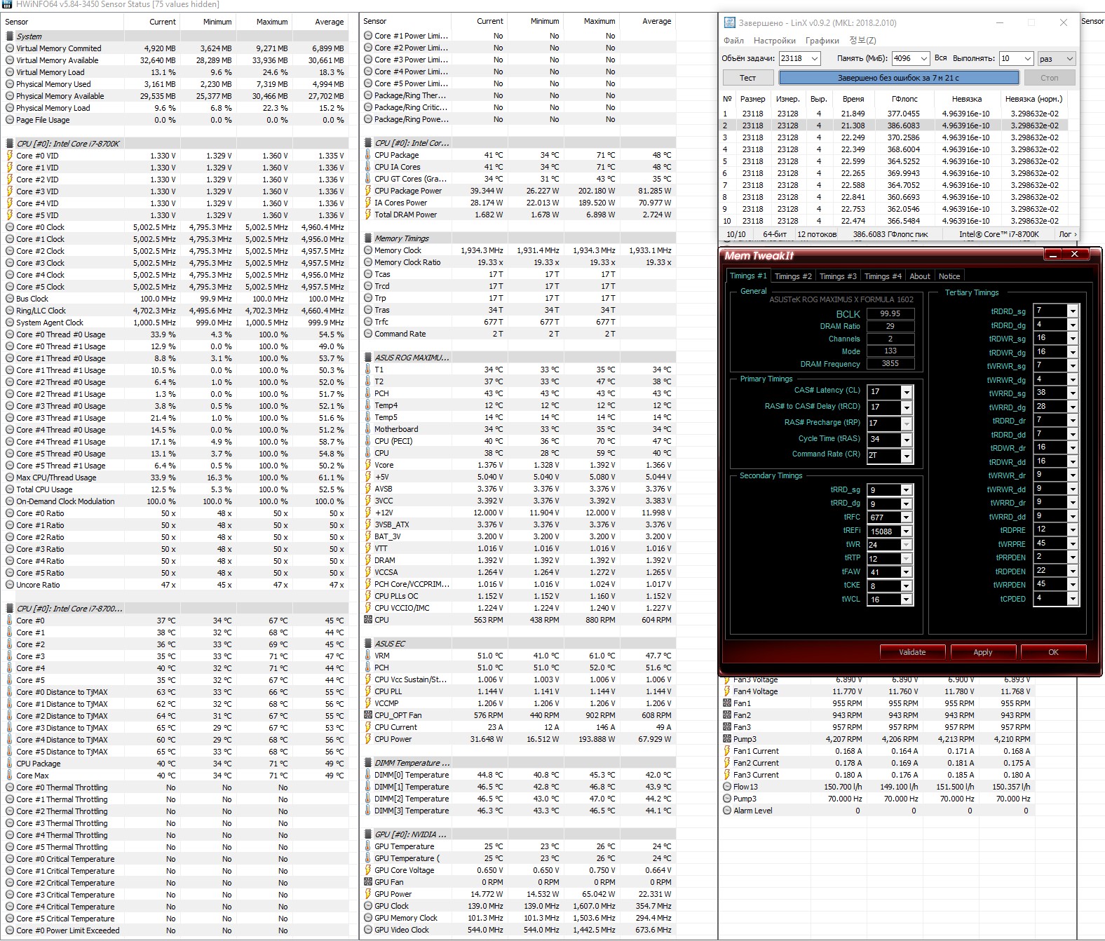 Конфиг в профиле, продублирую и тут Asus MAXIMUS X FORMULA Intel Core i7-8700K G.Skill Trident Z RGB 32GB DDR4 32GTZR Kit 3866 CL18 (4x8GB) Охлаждение СВО.