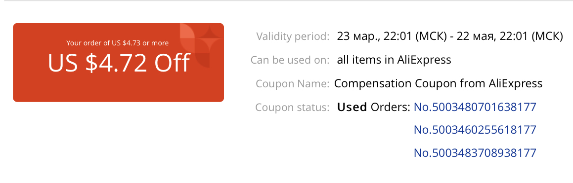 Недавняя моя радостная новость о том, что мне косоглазый выслал заказанную мною материнку через пол года оказалась фейком. Трек не пробивался. Я написал на почту. Мне ответили, что трек номер хоть и похож на настоящий внешне, но имеет неправильную контрольную сумму и потому никакого отправления не было. Я открыл спор на али. Через пять минут косоглазый согласился со мной и принял мое решение. Я думал вернут как деньги так и купон за такого же косоглазого нерадивого продавана. Так как купон был не халявный а компенсационный. Именной по сути за косяки прошлого продавца. Так вот Eva али умудрилась к купону приписать что я его использовал в трёх разных заказах, см на фото. И поэтому, говорит, если все три заказа тебе не придут, то мы тебе его вернем. Но это абсурд. Во первых я знаю что я его использовал только в одном заказе. Во вторых я вообще не представляю как можно один купон использовать в трех разных заказах. Научите кто умеет пожалуйста. Извиняюсь за офтоп.