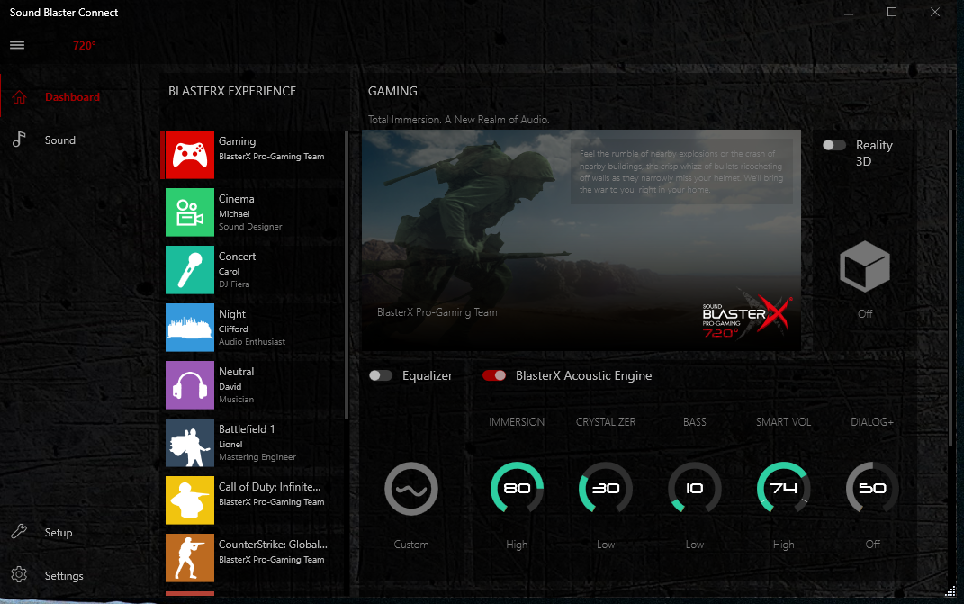 Там главное не переборщить(если всё ставить за раз) с перекрёстными эффектами(Nahimic 3 & Creative Sound Blaster Connect 2 & Dolby Atmos и пр.), а то долго не мог догнать почему в игрухе другой звук(не православный ) в ушах , пока до настроек долби не добрался.