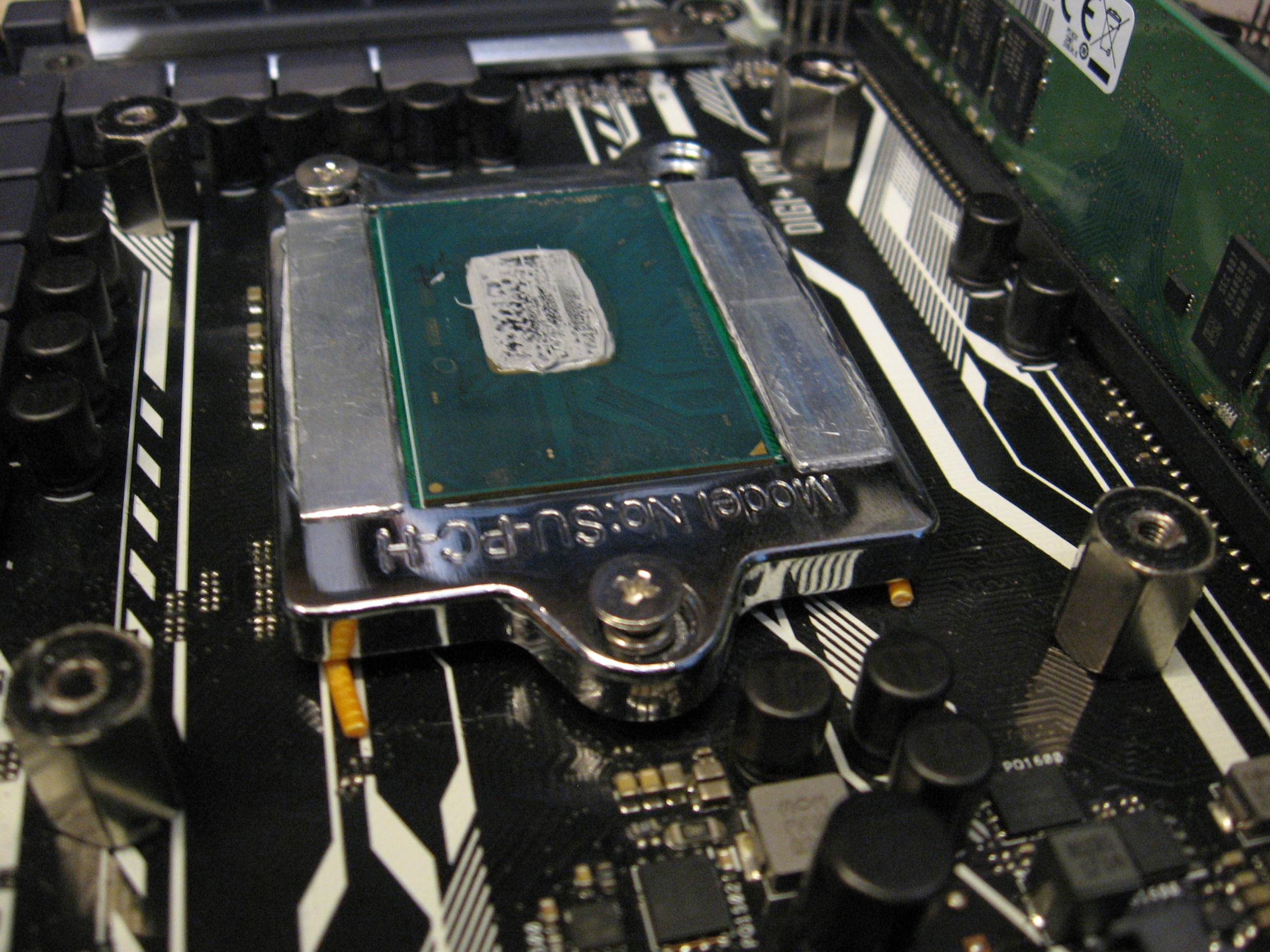 бич склеек в ровном прижатии. 0.1мм решает - будет ли проц нормально работать или нет. кристалл проца выступает над плоскостью рамки, в результате чего получаем прикольную ситуацию - выставили проц в рамке - все стартует, ставим охлад - он давит в кристалл и тем самым прижимает проц к контактам. Чуть криво прикрутили охлад - он через плоскость кристалла дал перекос на контакты - что-то отвалилось. Проставки на рамке почти нивелируют эту проблему Да, тут есть 1 момент, о котором я дополнительно расскажу в обзоре в течении 2х недель. Пока готовлю материал как сделать идеальную установку мутанта за 10 минут с первого раза. Потом дам ссылку на Муську где будет размещен обзор.