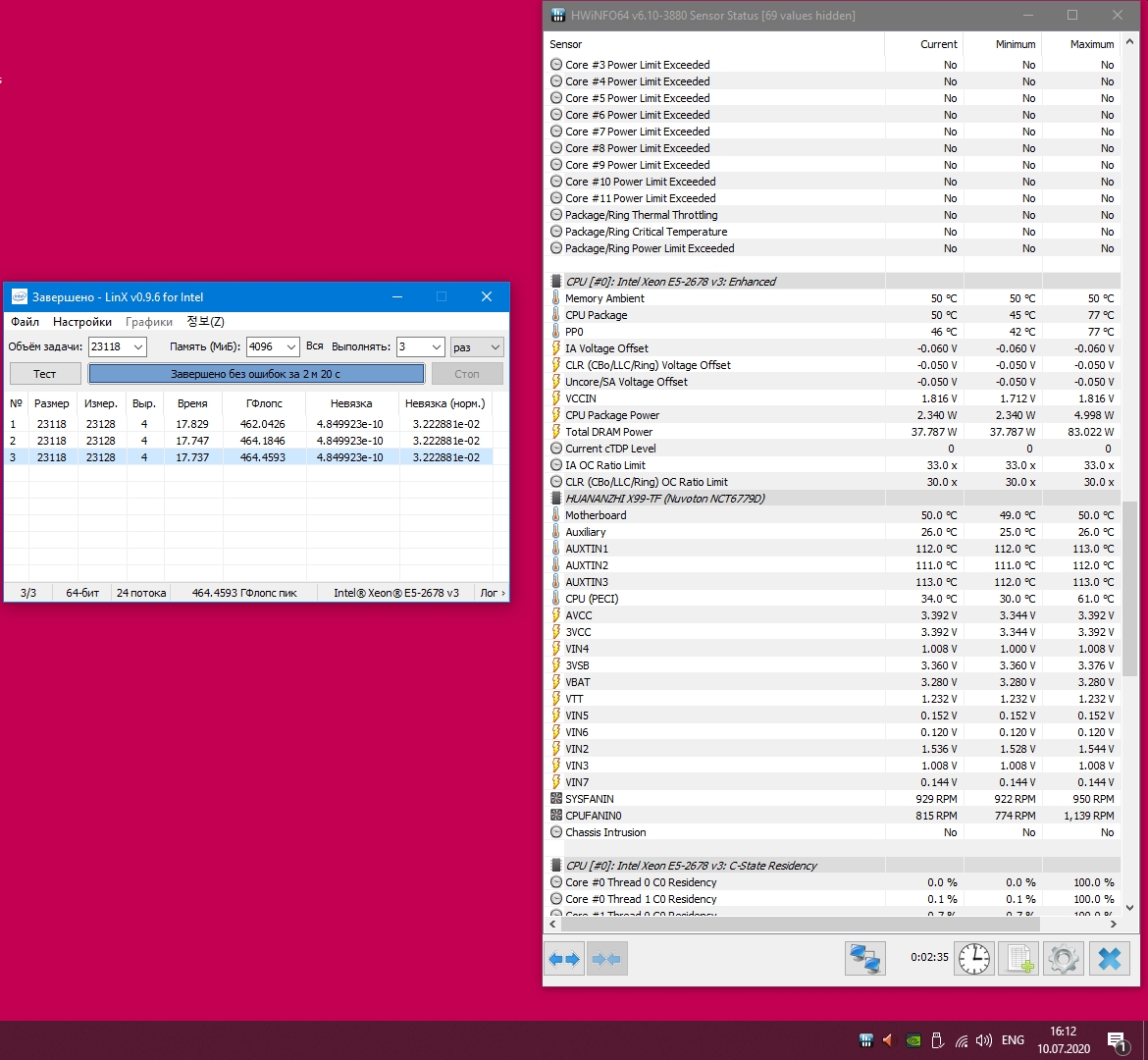 Для разгона множитилем как правило достаточно настроек стокового биоса, но в любом случае не прошивайте биосы предназначеные для анлока турбобуста процессров с заблокированым множителем, типа"с повышенным повер-лимитом и открытыми дополнительными настройками QPI". Для плат Huananzhi и других, использующих схожий биос, нужные настройки находятся в меню IntelRCSetup > Overclocking Feature > Processor и IntelRCSetup > Overclocking Feature > CLR\Ring. Основные параметры: Core Max OC Ratio — множитель ядер. Для Xeon E5 1650 v3 можно сразу установить 41-42. Core Voltage Mode — можно выбрать динамически (Adaptive) повышать напряжение или сделать статическим Core Voltage Override — выставляем напряжение на процессор в милливольтах, к примеру 1250, это будет 1.25 вольта (начать можно как раз с этого значения). Выше 1.30 поднимать с осторожностью! CLR Max OC Ratio — множитель контроллера памяти. По умолчанию равен 30, можно плавно повышать до 33-35 и тестировать производительность и стабильность. Core Voltage Mode — напряжение контроллера памяти. Аналогично Core Voltage Mode, но не выше 1250. Процессоры Haswell очень чувствительны к напряжению контроллера памяти, более-менее оптимальным считается 1.25 вольта, поднимать выше стоит с особой осторожностью.