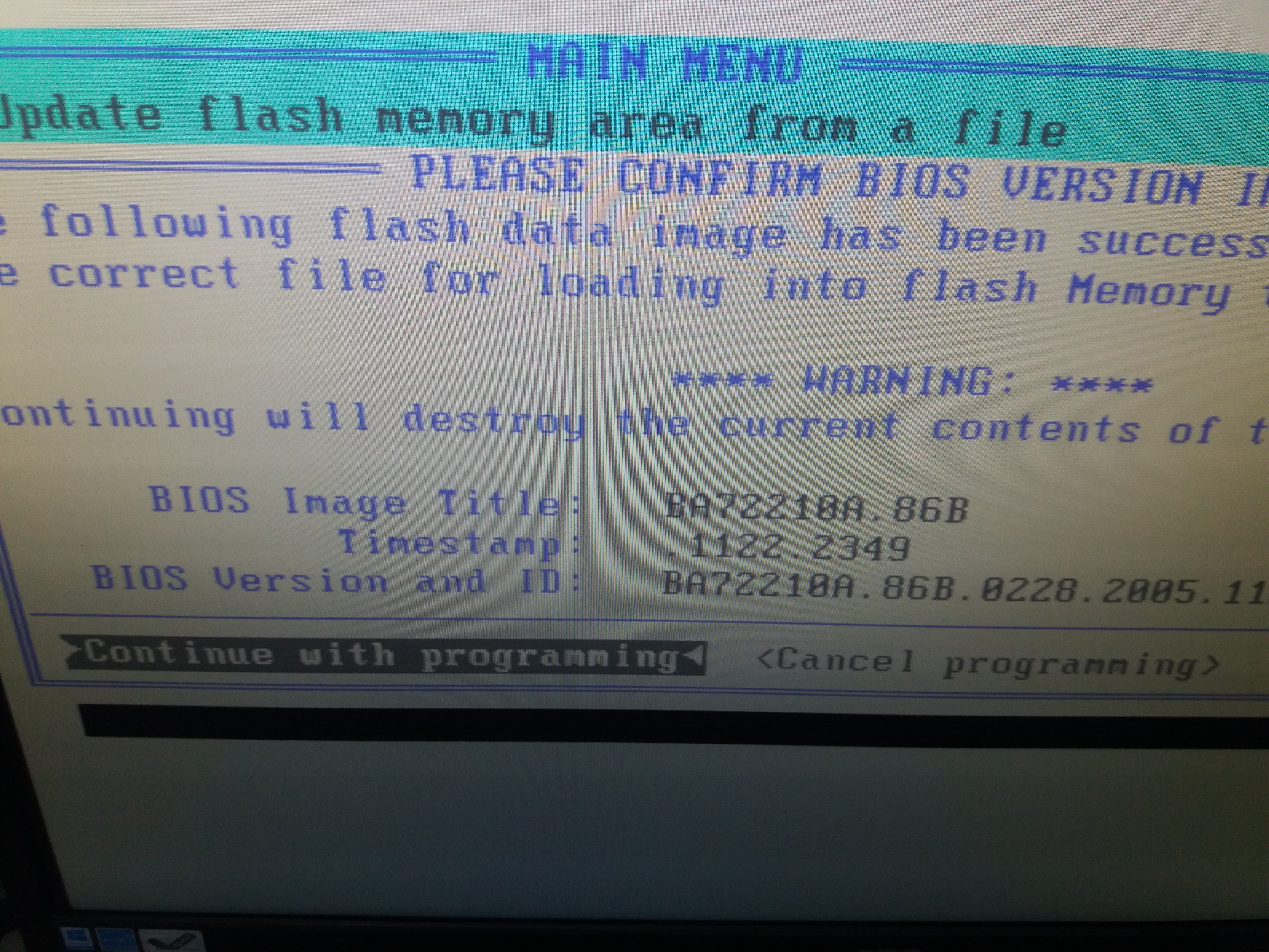 Добрый день! Совсем замучался, пытаюсь обновить биос на материнке intel SE7221BA1-E 1. Создал загрузочную флеху с dos и закинул на жесткий iflash с файлом обновления биоса 2.Загрузился с флехи, запустил iflash, который тут же увидел файл обновления биоса *.bio 3. Дал команду его ставить 4.на последней стадии подтверждения, что я точно хочу его поставить клавиатура или программа на нажатие ентер не реагирует (скрин прилагаю). Что может быть и что можно сделать?