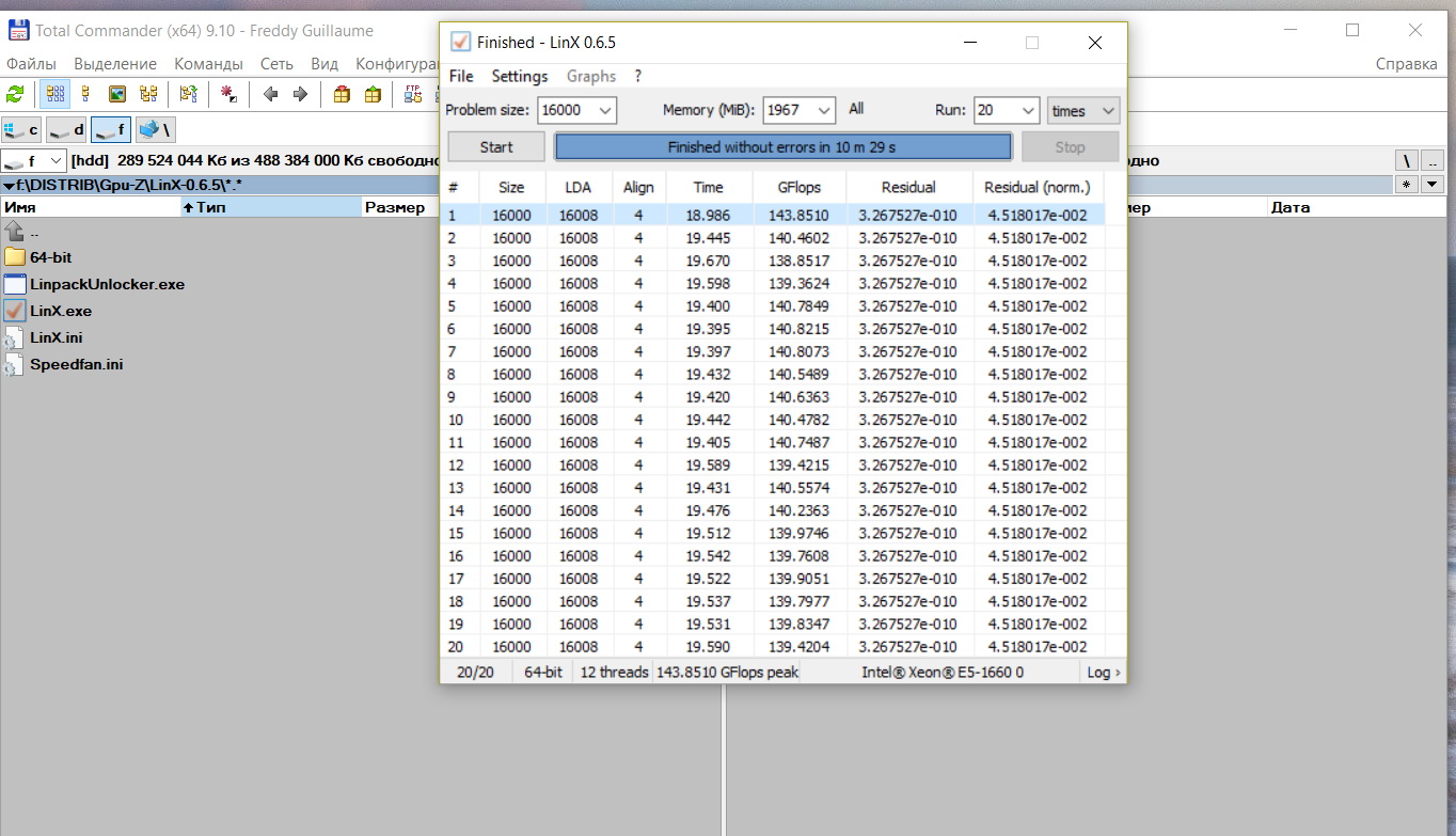Куратор A_z_z_y ранее писал, что стабильными в linx на E5-1650 должны быть 114Гфлопс. Прогнал ради интереса и я на своей профильной системе и у меня результат от 143 до 138Гфлопс. Кстати температура врм выше 50 градусов на протяжении всего теста не поднималась, причем запас мощности у ноктуа еще был не достигнут. Не может же быть такой большой разницы из-за того, что у меня E5-1660?
