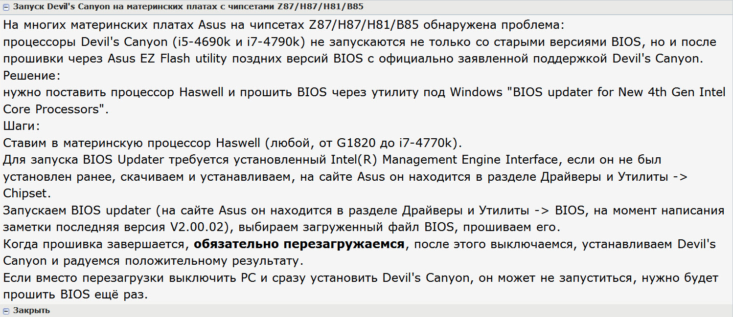 Если у вас не запускается процессор Devil's Canyon (i5-4690k/i7-4790k) на материнской плате с чипсетом Z87/H81/H87/B85, нужно прошить последнюю версию BIOS из-под Windows через утилиту BIOS Updater (не через Asus EZ Flash Utility). Подробнее см. FAQ темы
