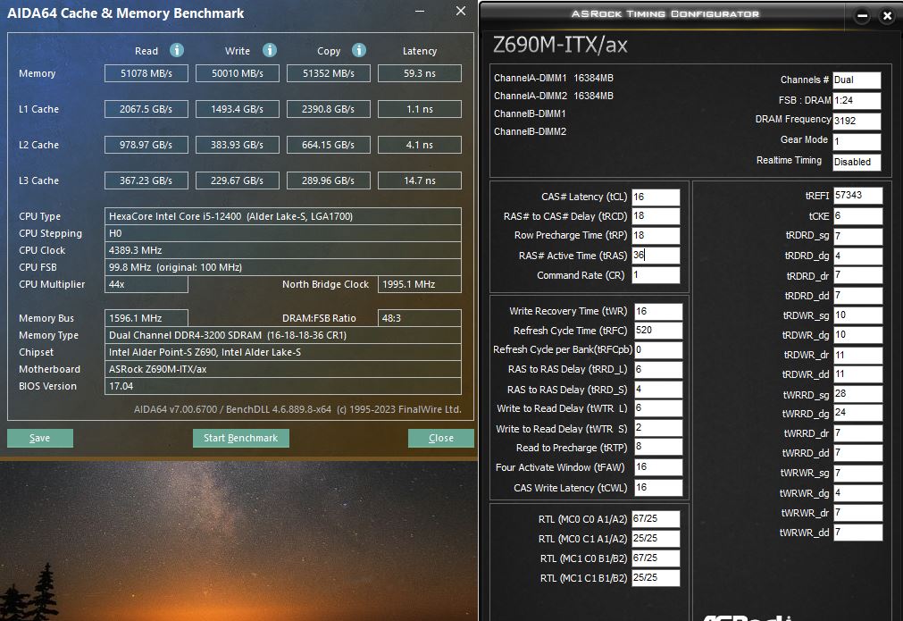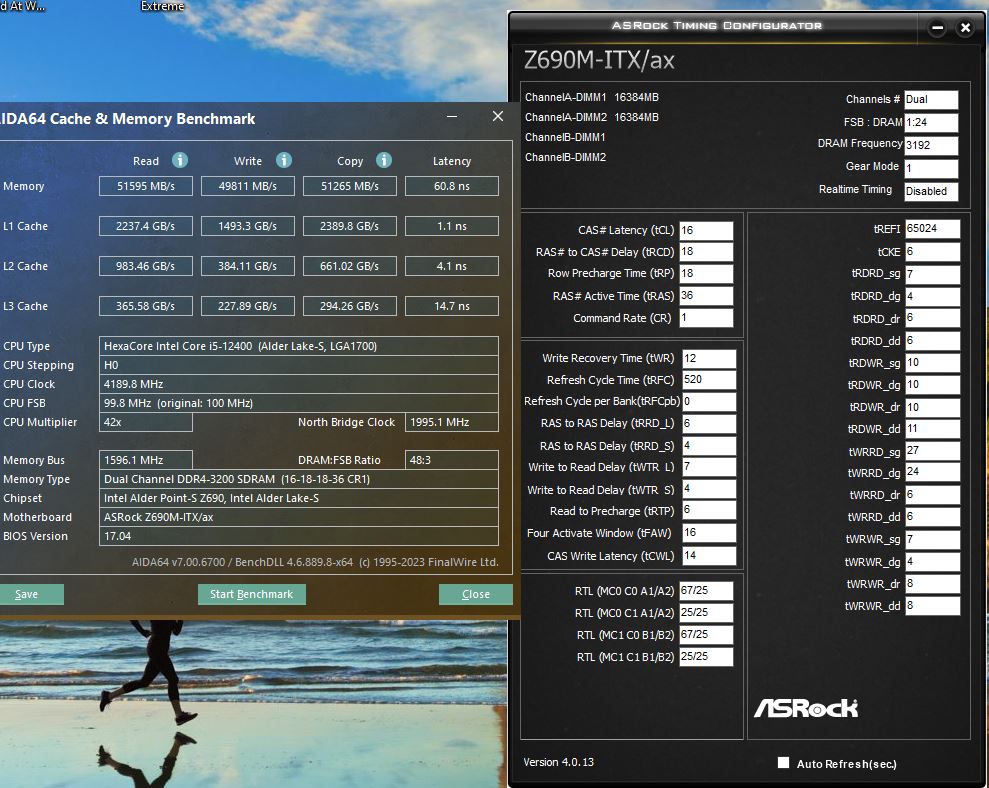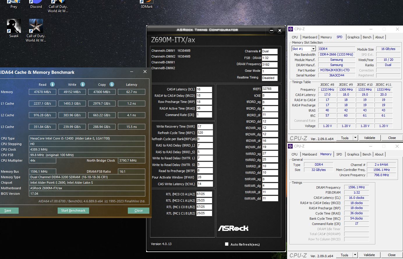 Приветствую! Приобрёл z690m-itx/ax, помогите настроить систему, на скорую руку настроил первичные и пару вторичек (самсунг c-die 2x16), вроде всё работает, но наверное можно ещё где подтянуть. Цель - выжать максимум с данными первичками и напряжением 1.3 (меньше - лучше). С платформой знаком первый день, сильно не пинайте..