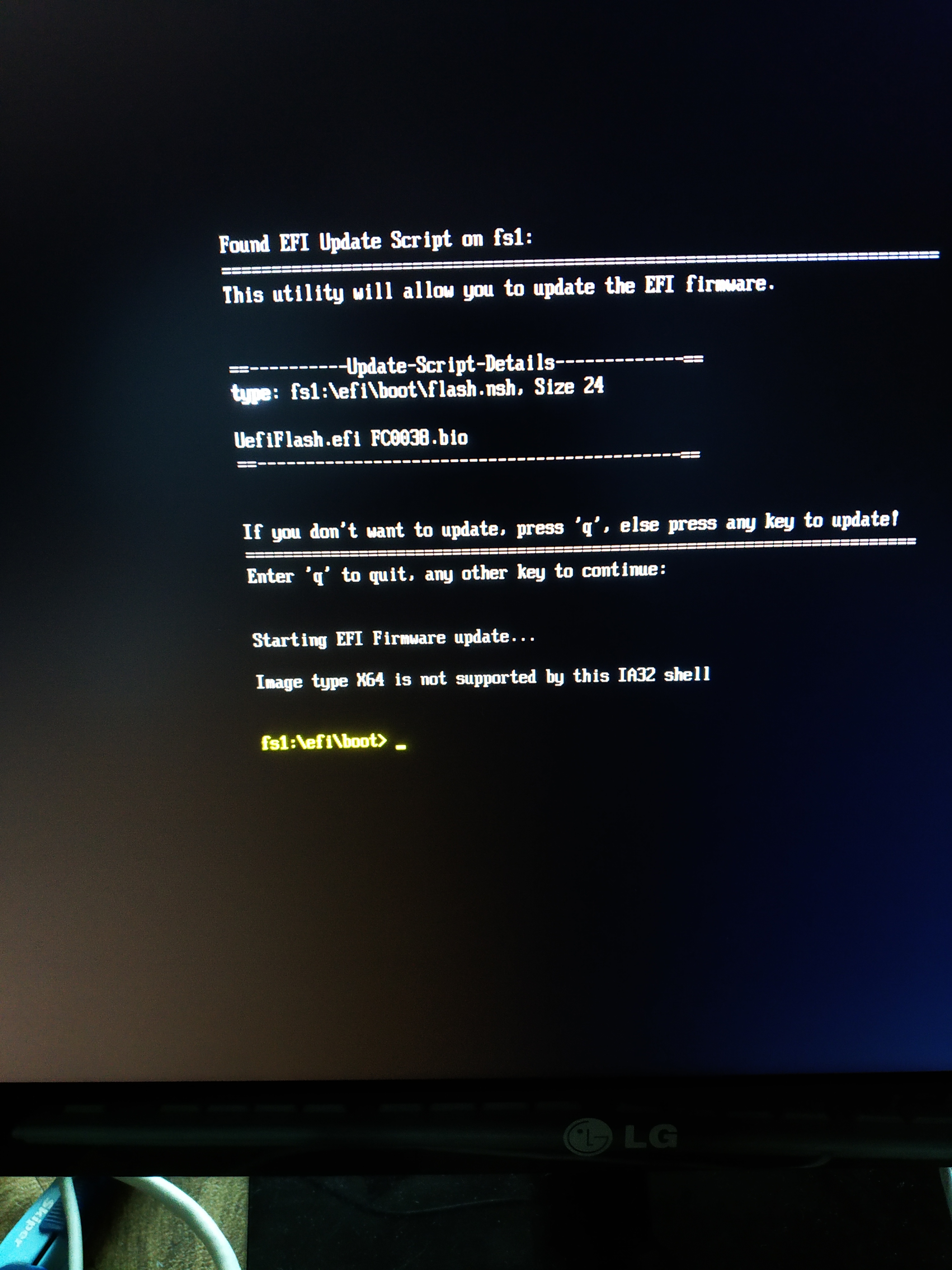 Всех приветствую, помогите плиз, хочу обновить биос на Интел стике STCK1A32WFC и получается странная картина, скачал с сайта интуля архив с биосом и ефи-флешером https://downloadcenter.intel.com/ru/dow ... OS-10-86A- , но прошивка не идет, то ефи ругается что приложение 64 битное и не может выполнятся в 32-битной среде ( Image type x64 is not supported by this IA32 Shell) , когда в биосе выставляю в выборе ОС "линукс 64 бит", то все начинает работать и грузится, но прошивка не идет пишет Capsule update failure. Unable to query system capabilities - опять что-то не так с совместимостью, пробовал по инструкции https://www.intel.com/content/www/us/en ... ticks.html