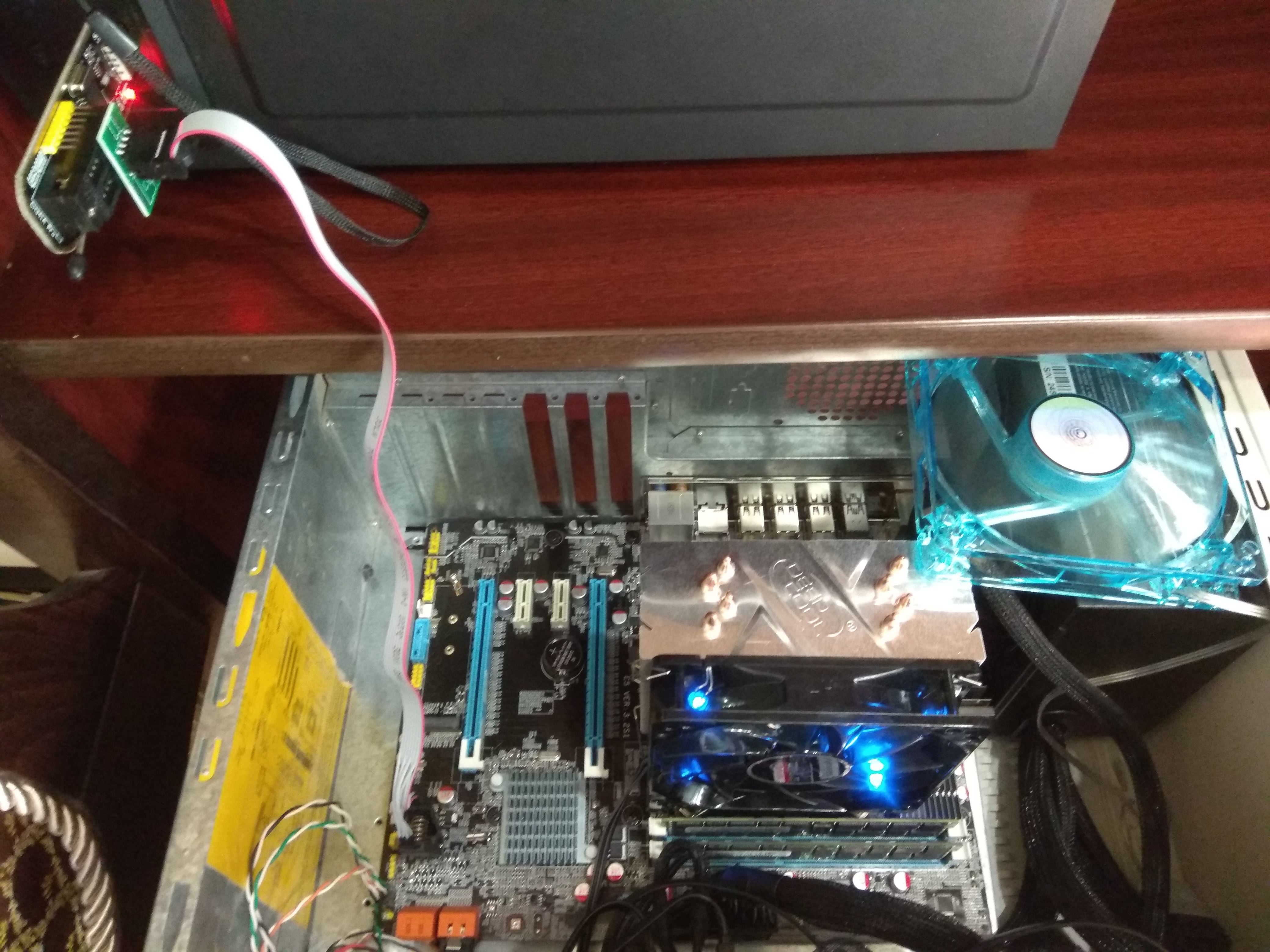 как видно на фото, 24 пин от БП идет к плате, у меня программатор определил его и с БП и без него. Также на фото видно, что вентилятор синий справа сверху который - крутится. Крутится он чуть-чуть. Также видно что светодиоды на кулере процессора горят. От программатора по его проводкам ток пошел получается