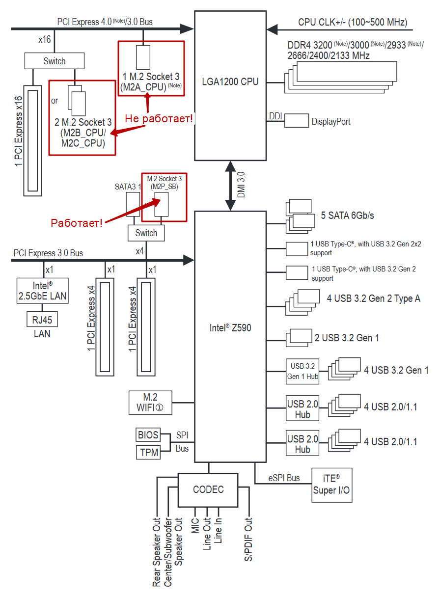Диски установлены в слоты M2A_CPU и M2B_CPU, пробовал в M2В_CPU/M2A_CPU и M2С_CPU - ничего.