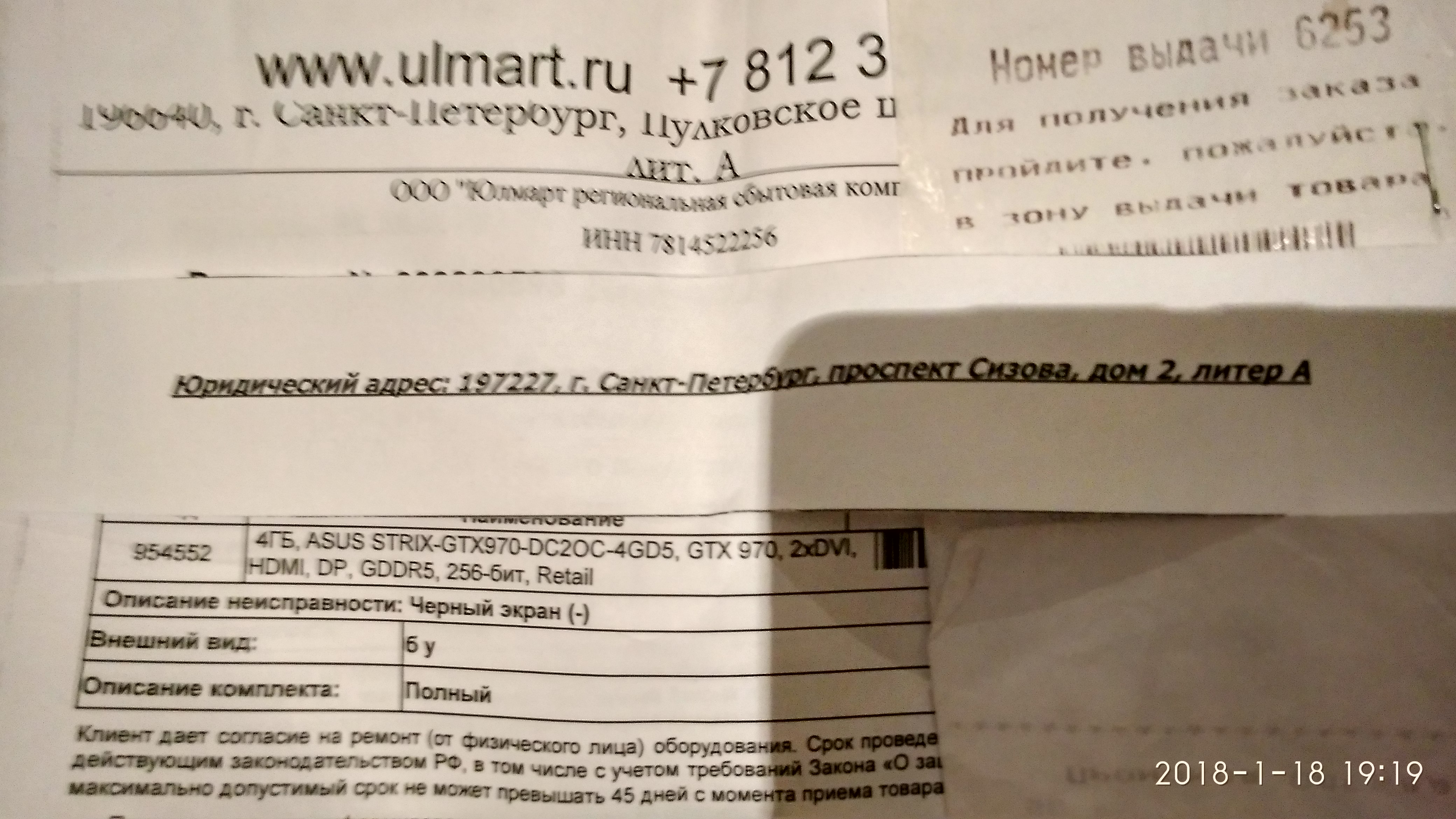 Ну вот, приехали, Юлмарт официально прогорел и решил кинуть всех своих клиентов с гарантией. Пришел сегодня в магазин, по ранее сданным видеокартам, (2шт GTX970 стояли в SLi) одна сдана повторно, после «ремонта по замене чипа», проработала сутки и за ней сразу же умерла вторая. Карты были сданы перед НГ, в 20х числах декабря. Уже тогда до меня доходили разные слухи, что в Юлмарте всех увольняют и после НГ будет другое юрлицо, магазин на Дыбенко уже с осени работал как «Юлплейс», но все исправно исполнял, (уже так было в 2013 году, когда ЗАО Юлмарт стало Юлмарт РСК, но обслуживать гарантию не перестало) но как то думалось что все обойдется, да и нести в гарантию их все равно было нужно. Сразу же при сдаче товара, было написано заявление на возврат денег, после открытия магазина уже в 2018г, по телефону горячей линии, барышня мне сказала зайти уже после 15 числа, что я и сделал, и с ходу был отфутболен. Ответа на заявление конечно же не было, и по всем вопросам, в частности возврата денежных средств, меня отправили обращаться в старое юрлицо, Юлмарт РСК, которое оказывается давно банкрот, (можно посмотреть в открытых источниках), официального письменного отказа в гарантии мне тоже никто не дал, с усмешкой на лице заявили, что с тем же успехом я мог бы обратится в ОКЕЙ, с гарантией от Пятерочки и что у них нет полномочий давать такую бумагу. Теперь фирма называется ЮЛМАРКЕТ, и де-юре к (банкроту) Юлмарту РСК, она не имеет никакого отношения. Но по большому одолжению, если их сильно попросить, они могут вернуть мне сданное НЕИСПРАВНОЕ железо, которое к ним зашло до НГ.