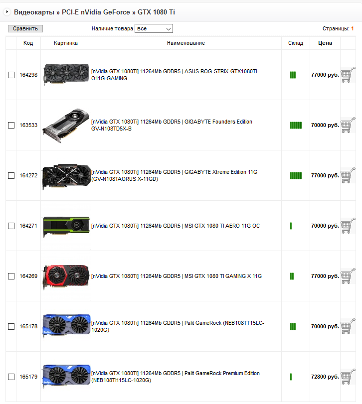 Мда, дурдом товарищи... На моем веку такое безобразие наблюдаю впервые. 10 дней назад успел урвать предпоследнюю 1080ти в технопоинте за 52к (была еще мси гейминг за 55к и один реф под заказ за 51к). На другой день уже и этих карт не было. Сегодня зашел в личный кабинет технопоинта, нашел свою карту, открыл на сайте и офигел от ее цены - 66к, Карл!!! И при этом "нет в наличии"...