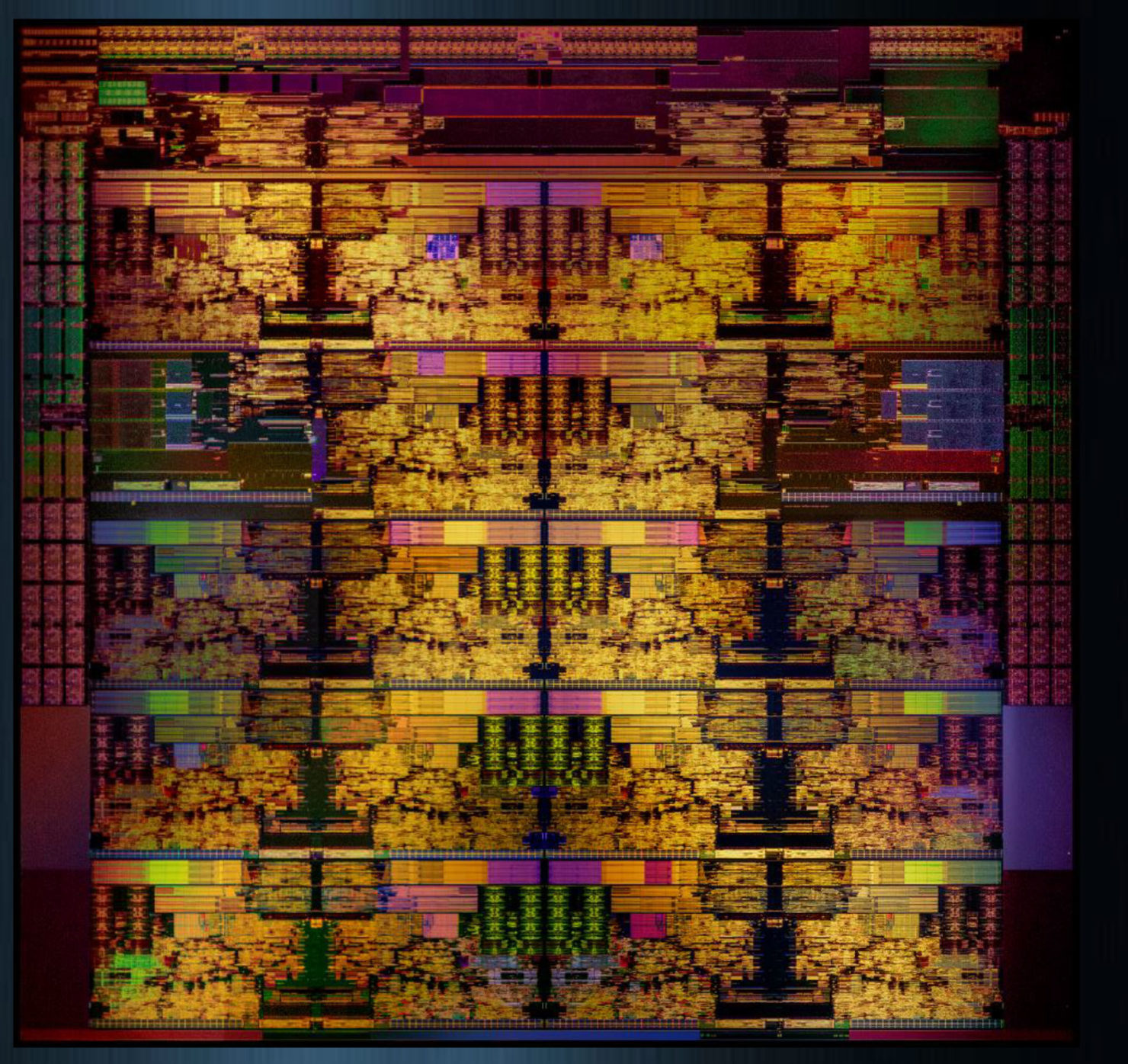 Все элементы на тех же местах и кстати прямоугольнички размером с ядра явно обозваны memory controller хотя наличие там достаточно больших однородных участков явно говорит что там еще и кеш, кеш всегда выглядит такими правильными однородными прямоугольникам, но кроме того мы видим, что новая межсокетная шина выглядит очень похоже на шину PCI-E - такие же блоки. И видимо эти блоки могут работать и как межсокетная шина и как pci-e. Тоесть теперь в однопроцессорных конфигурациях межсокетная шина будет как обычная pci-e работать, а в двухпроцессорных количество линий pci-e станет меньше у одного процессора, но за счет второго вырастет. серенькое домысляы конечно мои.