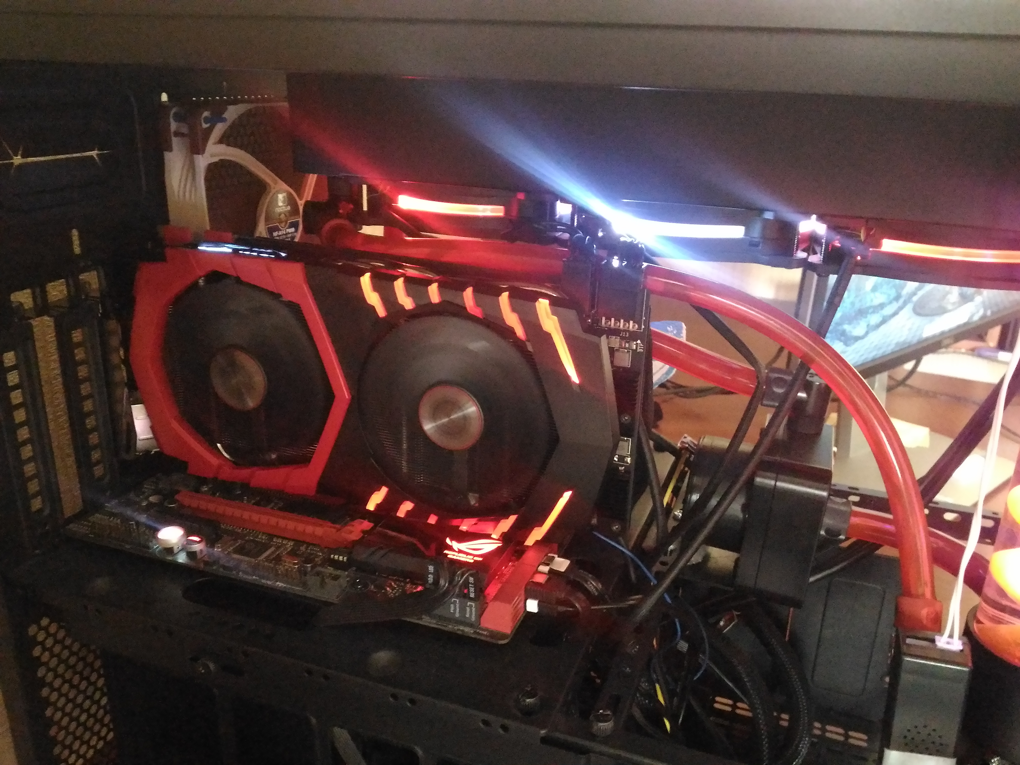 olegdjus У вас ваш "аквариум" прям как гирлянда Кстати, я так понял, вам чтобы вытащить и вставить карту, надо шланг снимать? Вот я смотрю, сейчас тенденция пошла лепить везде RGB-подсветку на СО видеокарт. Прямо бум, начавшийся с паскалями.. Однако. в стандартных корпусах бОльшая часть подсветки будет не так явно заметна, ибо карты то висят кожухом вниз.