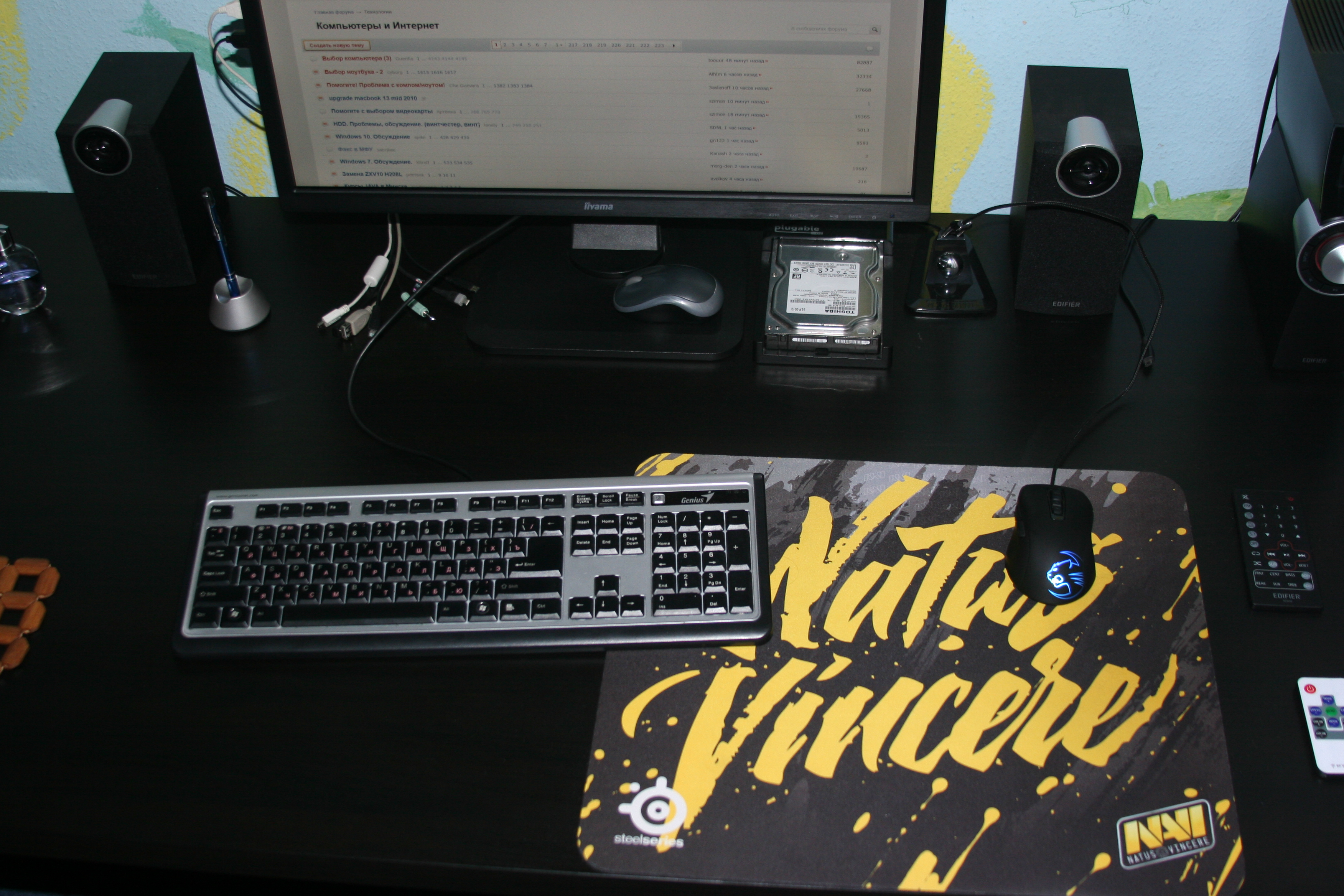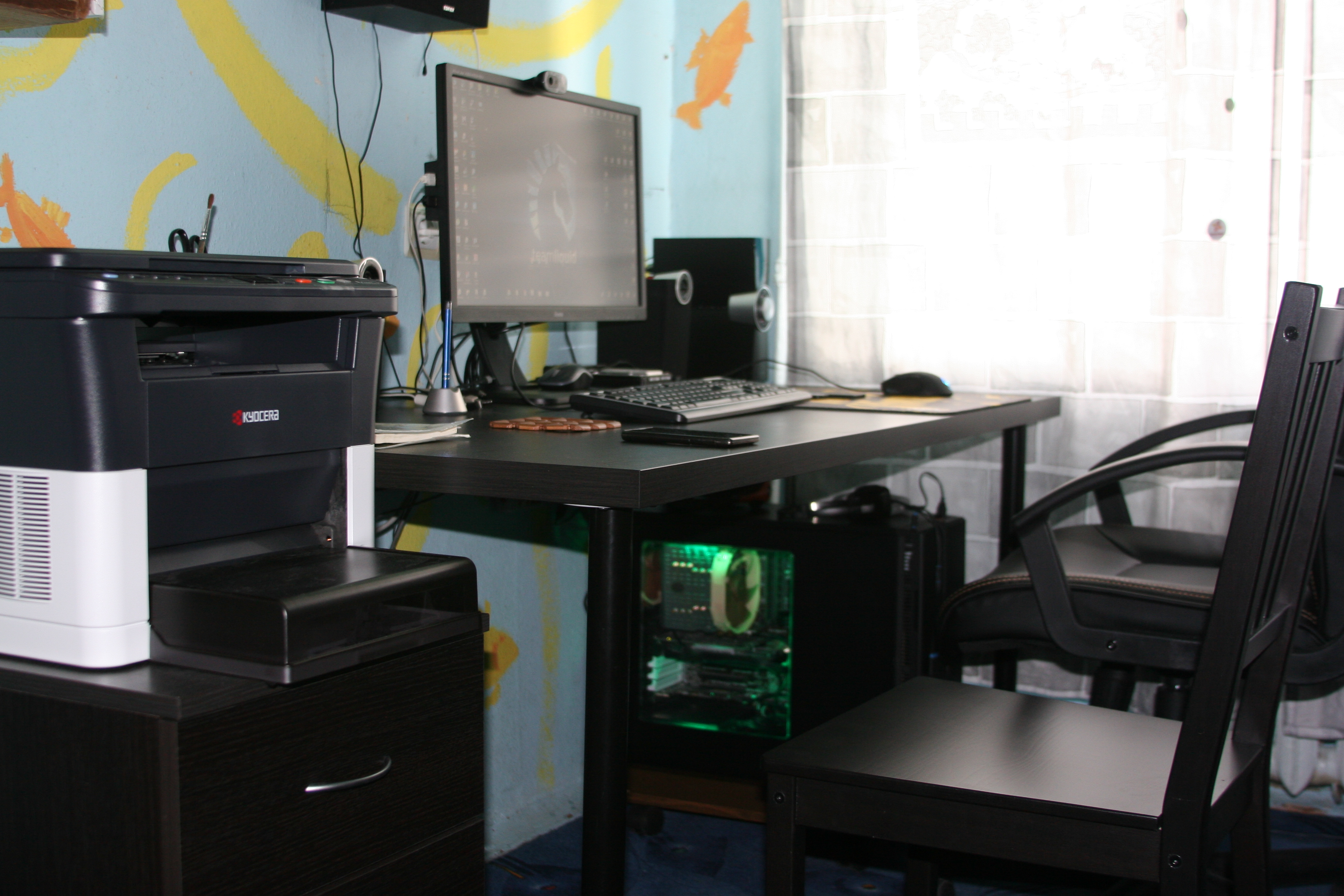 #77 Ну вот, наконец таки я добрался до этой темы) Немного прибрался, протёр пыль. На рабочей неделе ноутбук уезжает на работу. За шторой спряталась MORA, за ноутом на самодельной стойте помпа. Меньший монитор - сенсорный. За большим монитором спрятался thinkcentre с 6ТБ который занимается раздачей и скачкой всякого. А, да, стол - индивидуальный заказ.