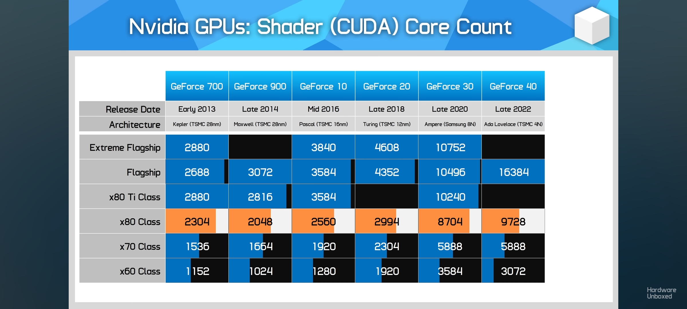 Итого по этой части: вся левая часть таблицы - полная бессмыслица, т.к. нет никакого "класса" x70 или x80. А флагманом в разные годы у одной и той же линейке де-факто были разные карты с совершенно разной производительностью