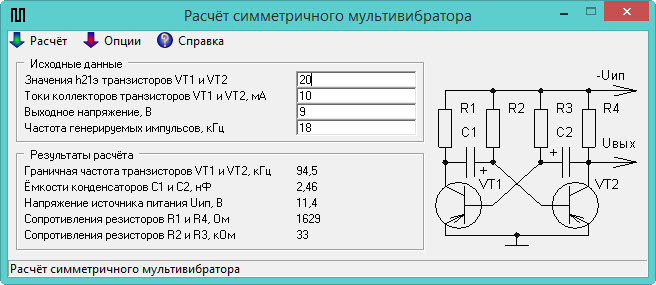 Понимаем мультивибратор Длительность импульса каждого плеча 0.7*R*С. Период, соответственно, в 2 раза дольше.