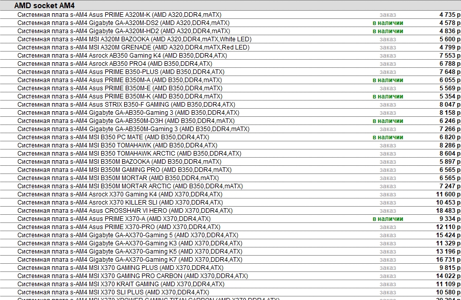 Матерей на Ам4 предостаточно, я недавно себе такой купил. Для своей фирмы 4 штуки купил и себе один. Материнские платы на B350 дешевле чем платы на Z170. Посмотрел цены на память взял память с частотой 2400, цена слишком кусается, я лучше больше объемом возьму чем частотой. Взял 16 гигабайт. Отдал я почти 10 за комплект и 10 за мать. Переплачивать за оперативку не собираюсь и так много все стоит. Память не гонится А вы будете еще покупать больше 10 тысяч за комплект. Это не три и не четыре тысячи. Нормальные комплекты памяти больше 20 тысяч стоят. Конфиги посмотришь у всех все по минимуму. Фанаты интела плачут что память не гонится. Вы ценник вначале гляньте и стоит ли переплачивать.
