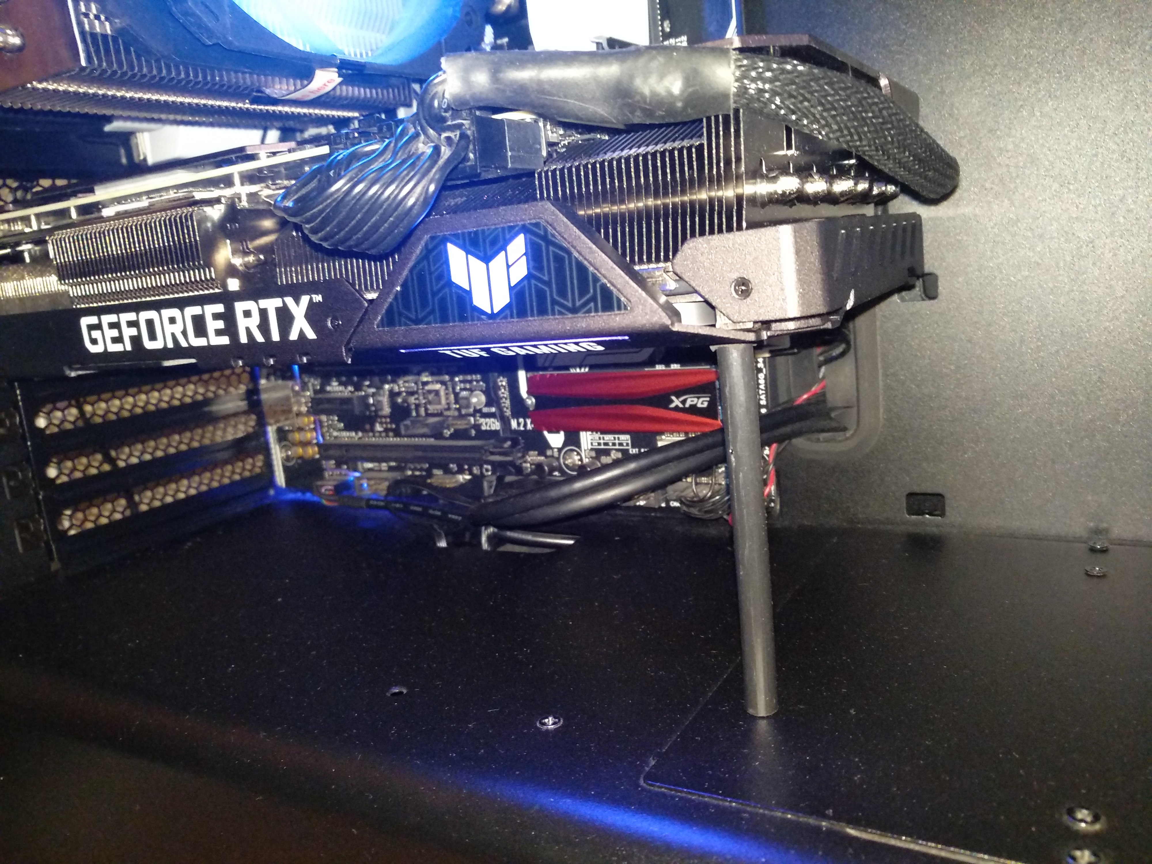 Нафиг эти подставки. Взял веревку, канцелярскую скрепку и стяжку и все готово. Делал так для GTX 1070. Сейчас 3070 без всяких подпорок. Так как там металлический каркас и карта не такая широкая.