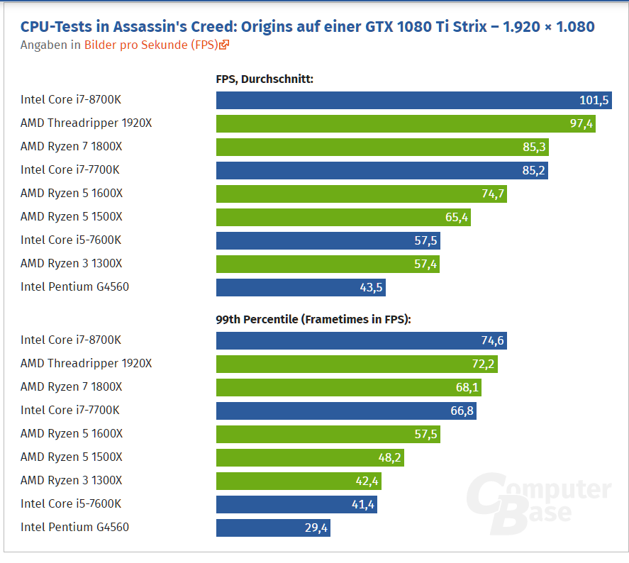 Что то интелофанатов не смущает то что почти во всех тестах 8400 тестируют с разогнаной памятью, а не 2400-2666 как его будут использовать, уверен что 6 ядер вполне заметят разницу в частоте оперативки с 3200 и выше в тестах сравнениях с 1600.