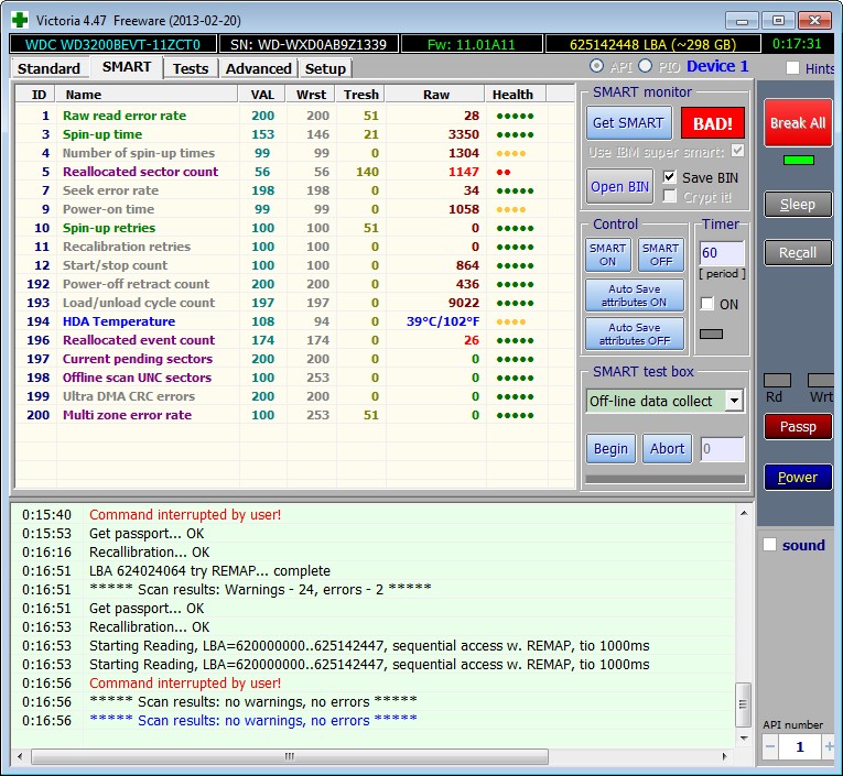 Съездил домой, погонял хард. Значит так. Low Level Format - не проходит. Пробовал трижды, останавливается все время под самый конец операции в одном месте, программа натыкается на ошибку и HDD "отваливается". Пока компьютер не выключишь-включишь его уже не видно. Смарт теперь красный: Reallocated Sector Count - 1147, причем с каждым проходом Low Level Format их число увеличивается ~ на 300-400. Скрины прикрепил. Логически рассуждая - диск роняли. Особенно на эту мысль наводит содранная краска на одном из углов харда. И видимо на поверхности царапина... Хотя это только догадки. Радует, что эти проблемы возникают в самом-самом хвосте харда, на последних гигах. Глядишь - отсечь этот хвост и пациент еще какое-то время проживет... Но, как я уже говорил - я далеко не спец по хардам. Мне до сих пор везло, ни один дома не умирал "на моих руках". Хотелось бы, если можно, услышать мнения специалистов.