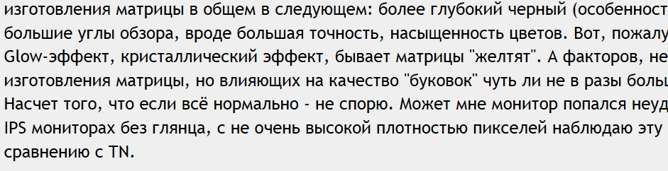 Проиллюстрирую сказанное. Вот увеличил масштаб отображения всей страницы в 4 раза. Шрифт четок, прекрасно читается - файл №1. Но он огромен, и я вижу только четверть страницы. Не удобно. Вот нормальный масштаб - страница форума в ширину экрана (а размер шрифта у меня не маленький - 16-й). И увеличенное изображение текста - файл №2. Видите, что там творится . На TN было заметно лучше. Хотя причина может быть и не в IPS, и не в отсутствии глянца. Может, матрица попалась некачественная, схемотехника монитора работает некорректно...
