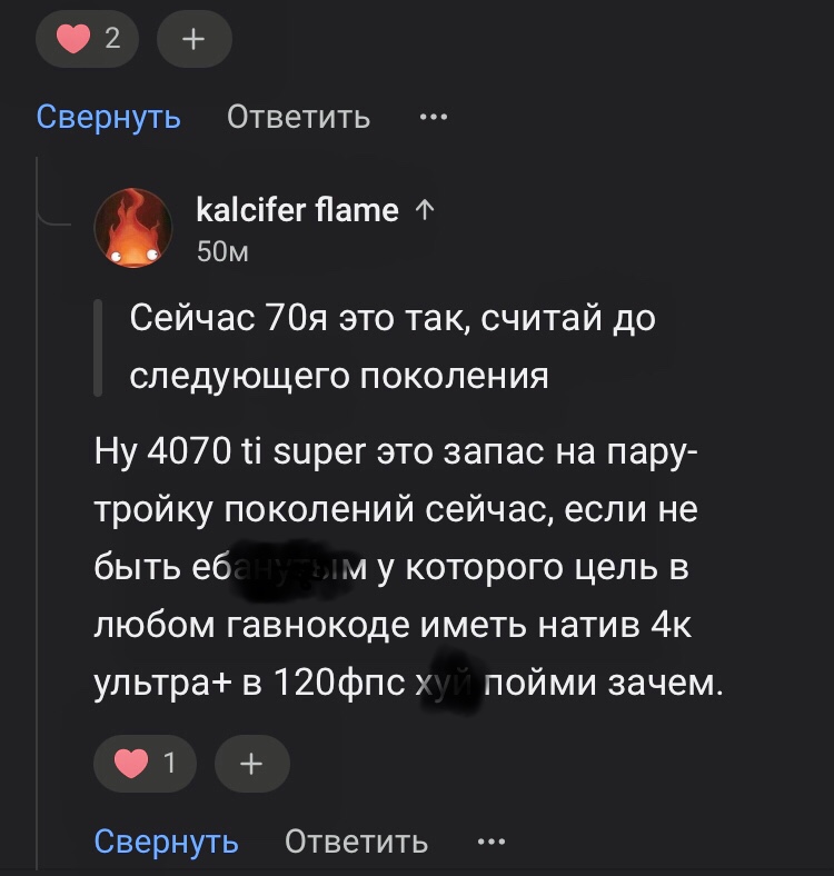 Но что ты прировнял свою 7900хтх уже к 5080 и советуешь покупать вместо 5080 людям 7900хтх, удивляясь какие там технологии у НВ - это явное обострение. Обрати внимание на здоровье Серёжа. Накидывать фобство по всему инету и самому же давать на него ссылки, да где в комментах обсирают, это конечно сильно )