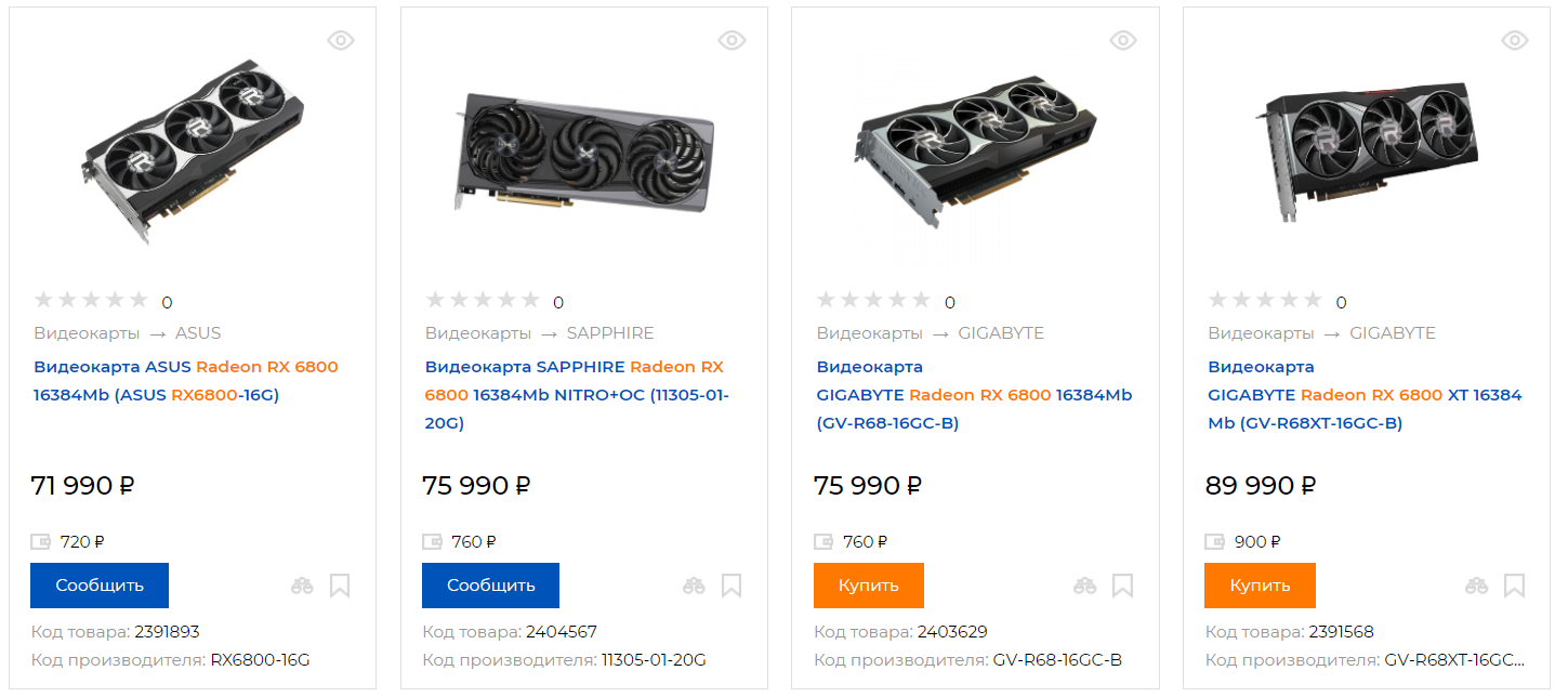 На озоне вчера куча гиг было по вкусным ценникам. Там надо мониторить постоянно или уведомления ставить. Я вот сегодня ровно на полминуты опоздал с заказом Aorus 3080 Xtreme и карта ушла ...обидно (карт было ровно 2 штуки сначала ценник был 102к, потом когда осталась 1 снизили до 92к).