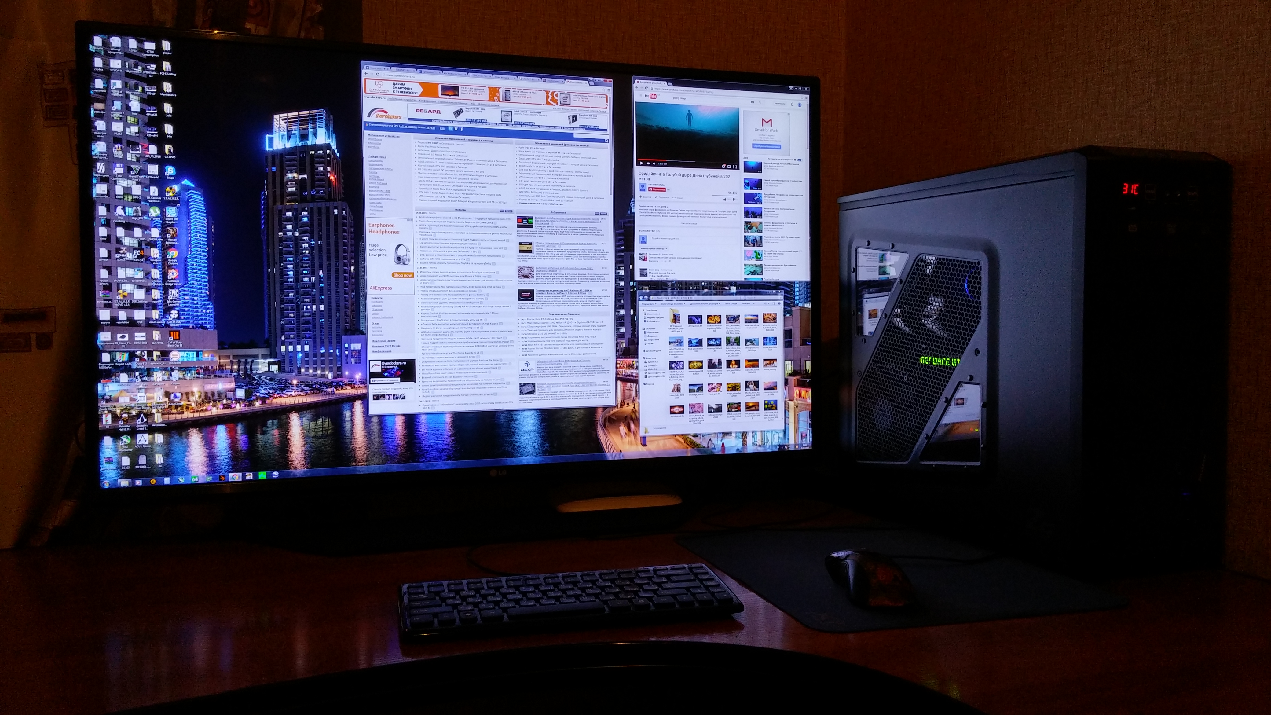 Мое место, пока так. В целом монитор поставил так, чтобы лежа удобно фильмы смотреть. Сплю на раскладушке Расположение колонок не совсем правильное, знаю. За качество помидорками не кидайтесь