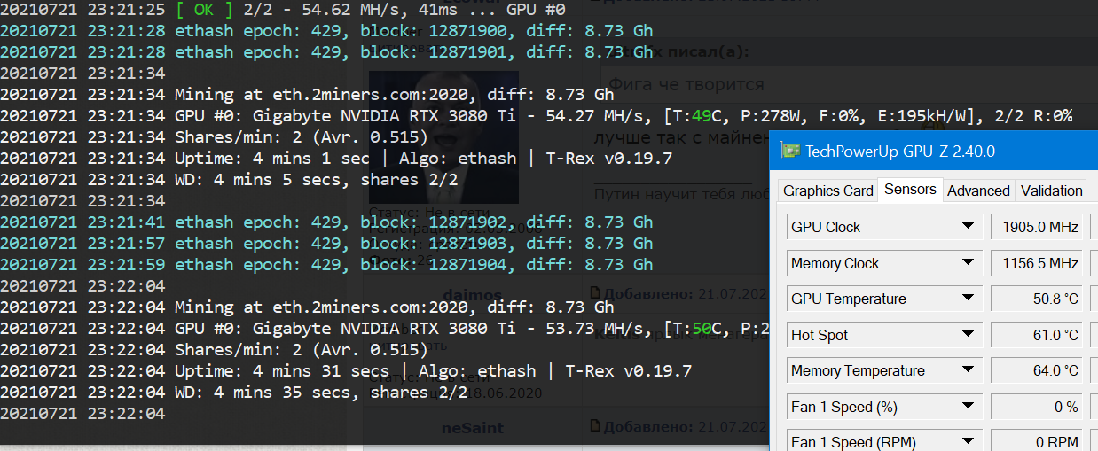 Спустя 20 минут майна при PL80% имеем 52° в среднем по чипу, 60° хотспот на чипе, и 70° по памяти. Лучше, я так понимаю, быть всё равно не может