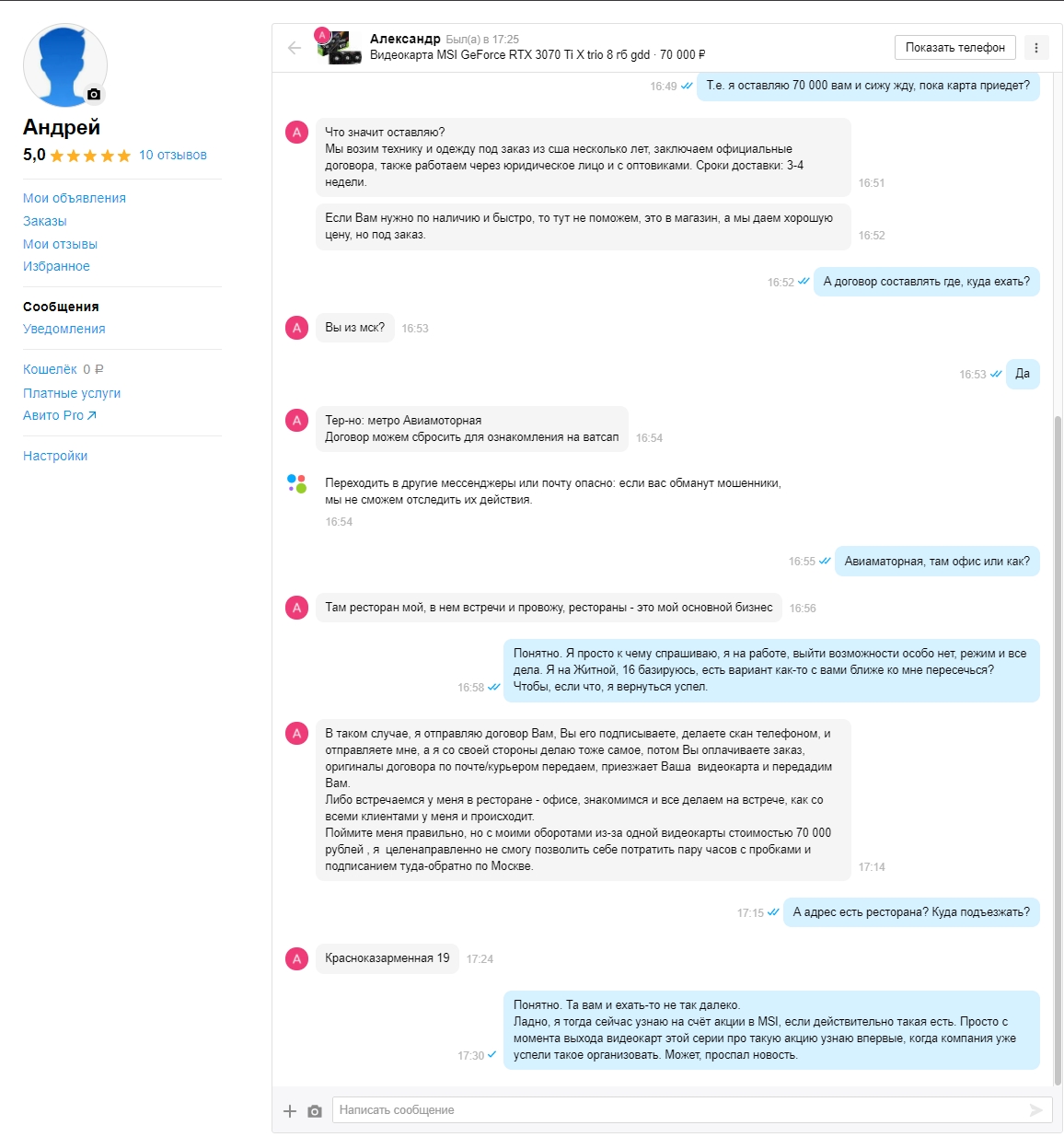 Всем хао. В поисках приобретения видеокарты наткнулся вот на такое объявление: ***** Он пишет, что это акция от MSI, поэтому 70k. Составляется договор у него в ресторане (его бизнес такой), я отдаю бабки и сижу жду 3-4 дня пока карта будет. Что скажете? Отзывов 18 штук, судя по описанию, вроде бы не накручены впустую. Если и накручивали от балды, то хорошо старались, расписывали.