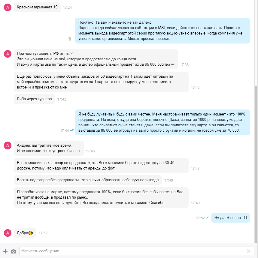 Да, заняться нечем больше. У меня свой профиль есть (могу скинуть) Ща как раз с этим "бизнесменом" переписываюсь, выложу переписку попозже, если интересно будет. Просто отзывы как раз и смутили, ну как "смутили", обычно пишут "Всё хорошо", "Продавец-молодец" и тому подобное, а тут прям вот расписали. Ещё момент, что про акцию написал....сколько за темой тут слежу, ни разу не слышал, чтобы MSI что-то подобное организовывала.