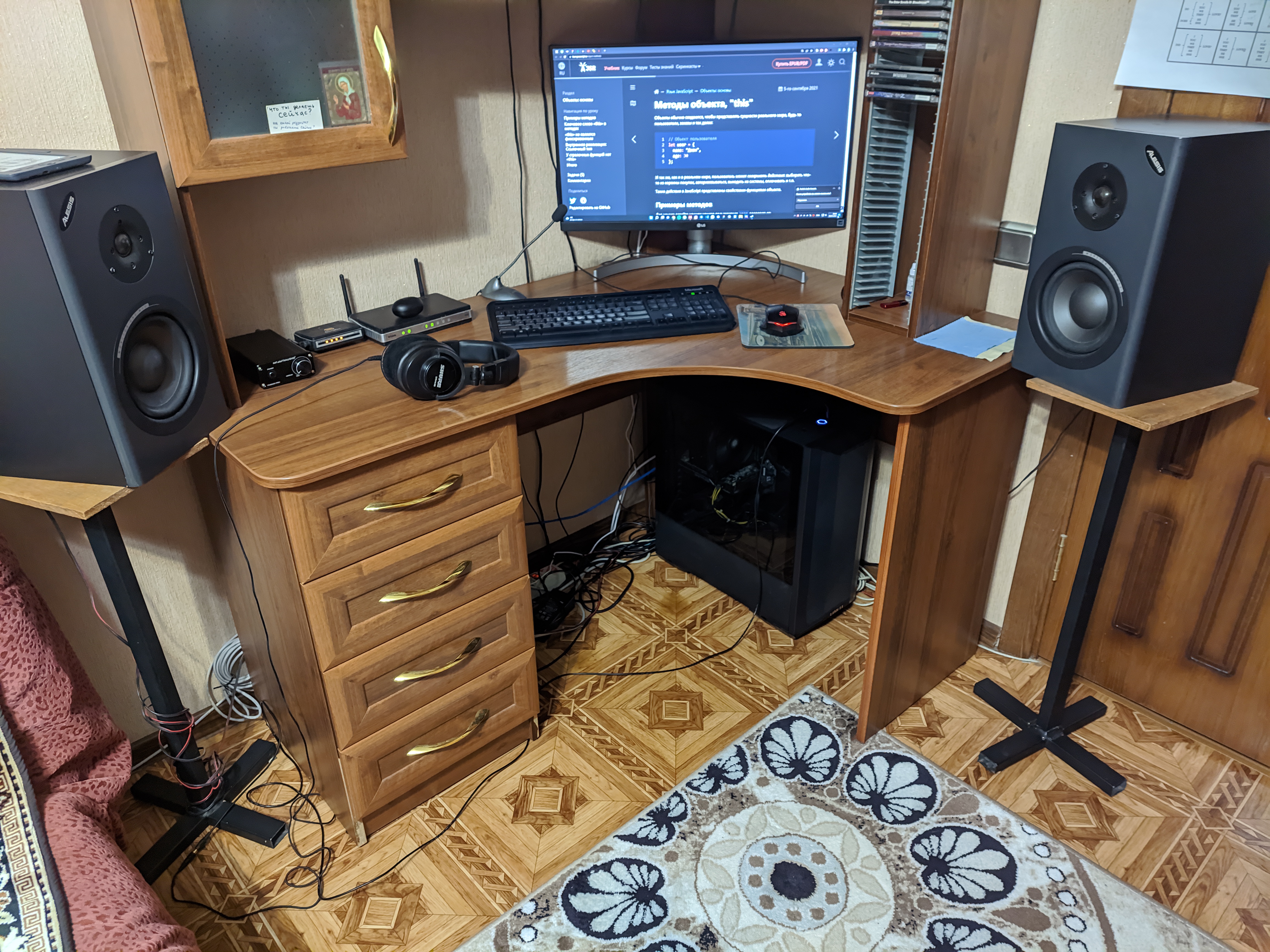 hardware, колонки проданы. Ибо почти не пользовался ими, да и качества они довольно посредственного были. Сейчас в раздумьях взять им что-то на замену или остаться полностью на наушниках. Вещи из тумбочки теперь находятся в другой тумбочке которая справа от кровати и её просто не видно в кадре. Рядом со столом в ней особой необходимости не было, поэтому принял решение перенести её. От полки, лично для себя тоже пользы особой не видел. В плане желаемого размещения мониторов она вообще мешала (оно не удивительно, в принципе, стол из середины 2000-х). А когда дело доходило до уборки, это было то ещё развлечение вытереть пыль со всех этих полочек, ниш и тд . Скажем так, при построении рабочего места одной из целей был как раз отказ от всего этого многообразия полочек и чтобы ничего не мешало в ногах. Куда всё разместить обдумывал заранее. Единственное, что не до конца учёл, это высоту стола при работе стоя: для одного из мониторов пришлось заменить кабель на подлиннее .