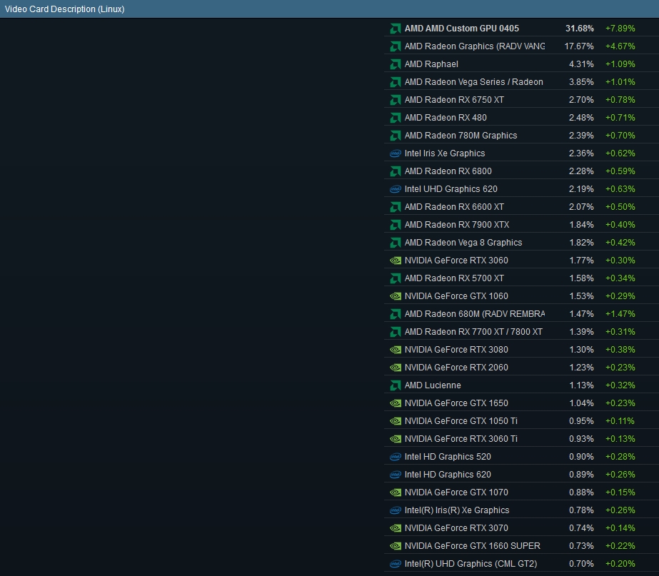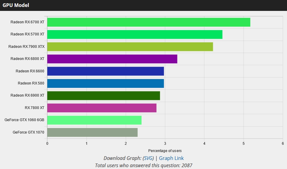Как видите, маркетинг Нвидиа там не работает. И не только из-за отсутствия опен-сурсных драйверов. Просто линуксоидов не окучивали годами про "Хуанга и его команду" и им плевать на все эти маркетинговые уловки. Как только Габен принёс игры на Линукс, местные стали трезвым взглядом оценивать конкуренцию между двумя компаниями. И, как видите на скринах, покупают активно Радеоны, в том числе и топы.