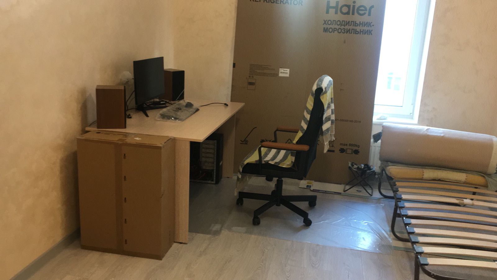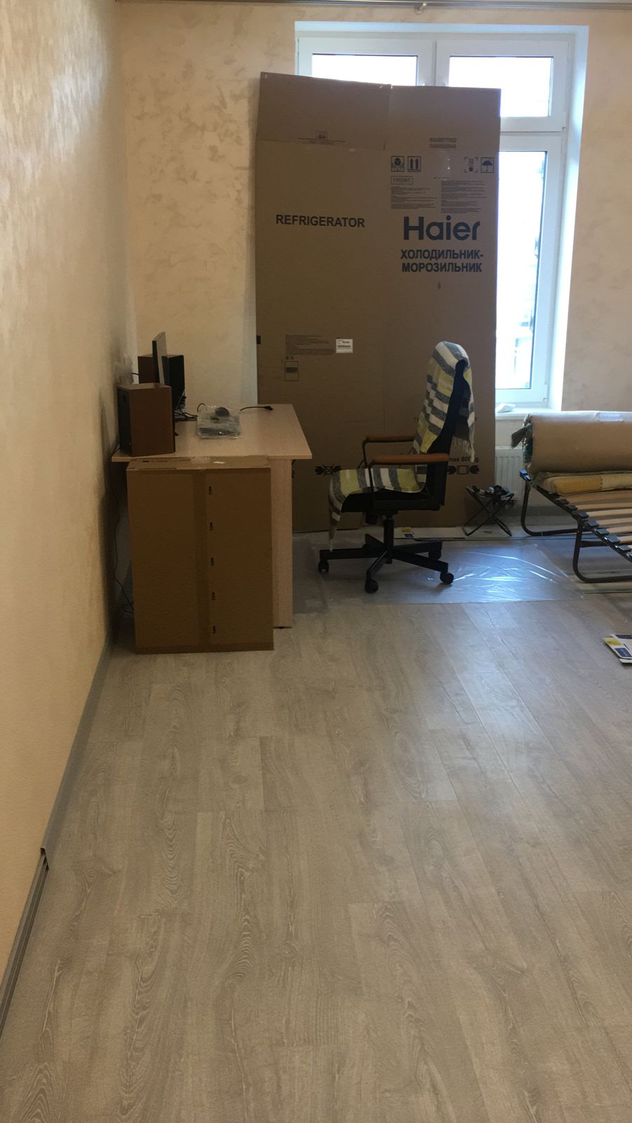 Да ремонтная квартира. Там пыли ещё полно летает. Я ж не для красоты. А просто так. Карнизы висят. Шторы куплены 2 месяца назад. И тюль тоже. Если повесить сейчас, то через месяц придётся их стирать. Картонка от холодильника очень кстати пришлась.
