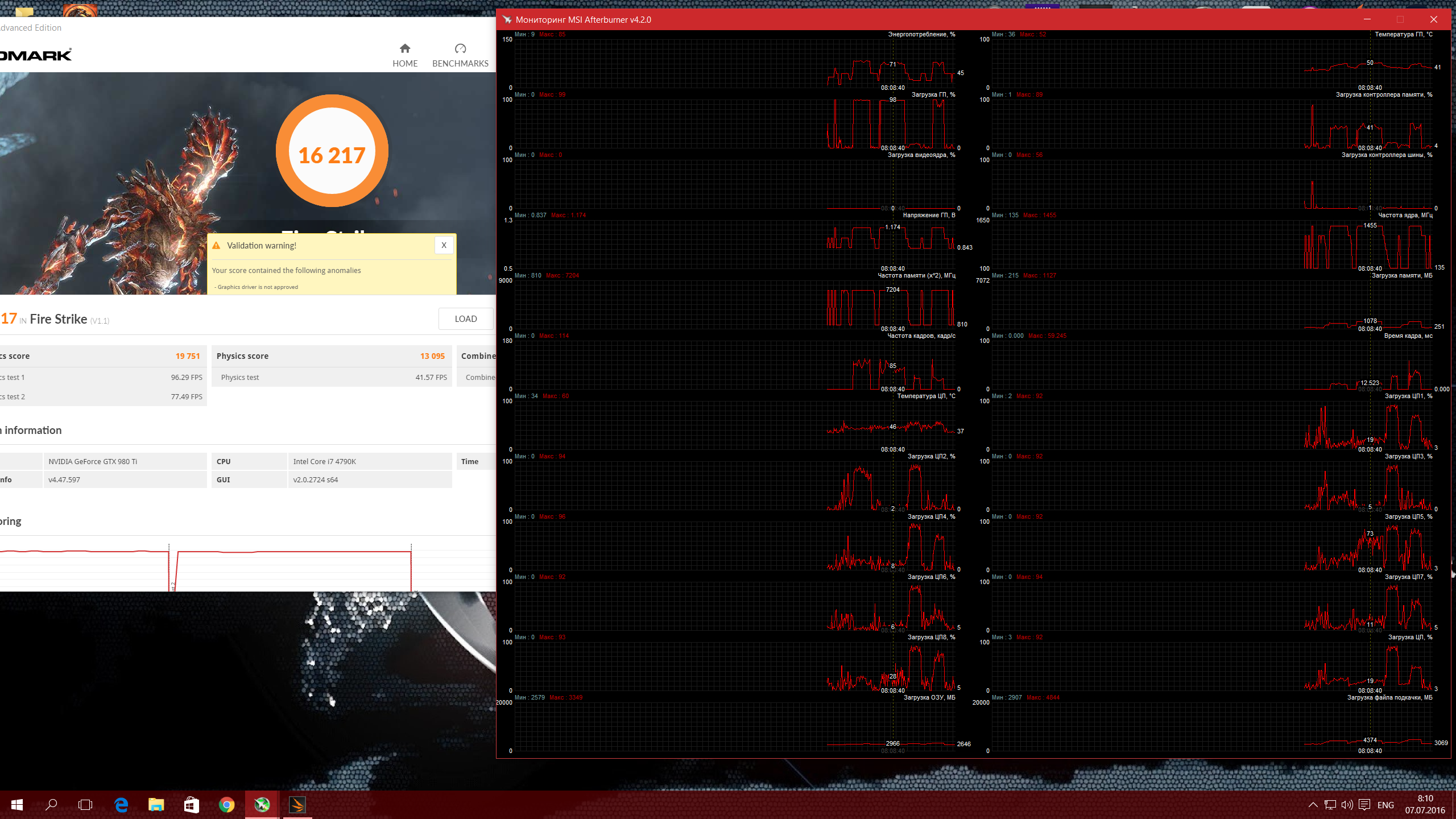 Nerfтесселяция отключена была (дабы сравнивать с другими результатами на hwbot и своими старыми , там ведь это все разрешенно и применяется почти всеми , владельцы нВидии лоды крутят что дает не меньший прирост а красные значит тесселяцию - все честно , даже у АМД честнее ибо картинка визуально не меняеется чего не скажешь о лодах на нВидии ) . Так что сравнивать лучше не с результатами из обзоров где эти вещи не меняют а с результатами на боте , честно говоря без понятия сколько там на 980 , а на 980Ti разогнанных видел у нас на оверах чуть больше 5200 тыщ было кажется в графических баллах , а на Fury X 5000 тысяч , так что конечно далеко ей до 980Ti и до Фури при таком скромном разгоне . Да и вообще этот скрин просто как демонстрация того что частоты жестко держатся теперь , там процессор i3 старенький , антивирусы и куча програм фоновых - просто проверить как работает утилита и держутся ли частоты стабильно вообщем