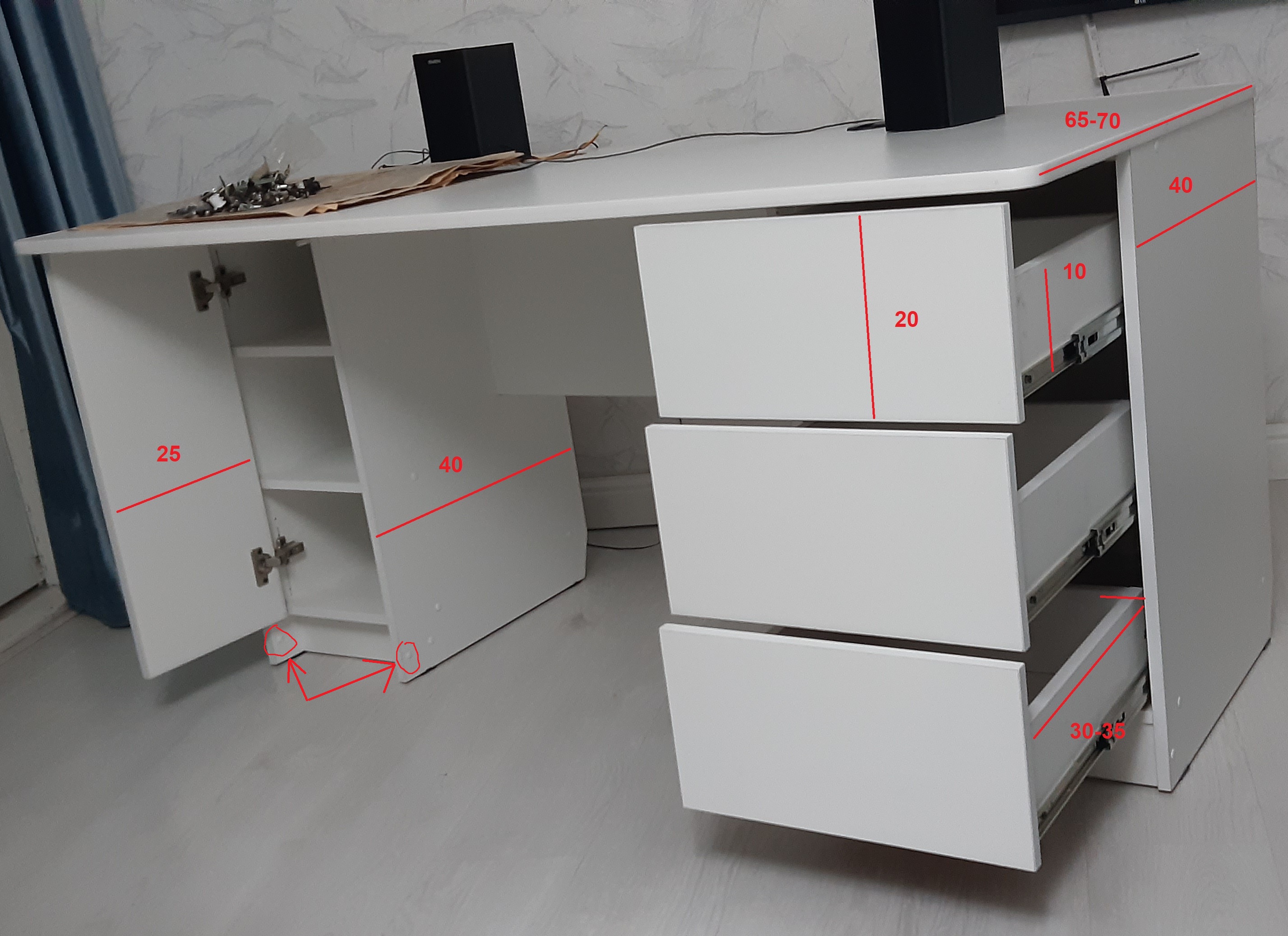 габариты не даны поэтому прикинул на глаз: глубина столешницы 65-70, глубина тумбочек 40, значит свес столешницы 30см. ящики выдвижные 30-35 скорее всего, нижний ящик выдвинут на полную, верхний на фото 5 см не доходит и уже фасад вровень со столешницей, стало быть у верхнего будет см 5 доступа для руки. ну окэй.