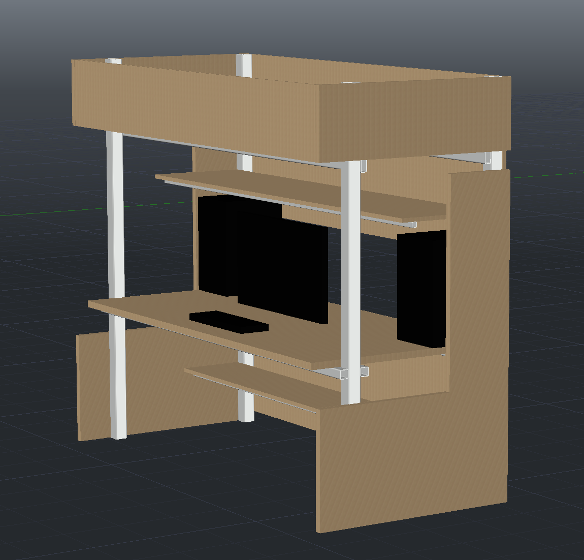 с такими "закрытыми" боковинами системному под столом не место. и задняя стенка ниже столешницы не нужна, не подлезть в системному ни подключить, ни отключить порты на задней панели материнки. только лезть под стол с фонариком. если задняя стенка чтобы не складывало ромбом, лучше просто укосины из профиля от пгоризонтальной перекладины к стойкам-ножкам. и боковые "перевернутые Г" убирайте, не нужны. пару укосин из профиля и всё. если уж мебель в стиле Loft, то "лофт", должна смотреться легко. просто "скелет", верхние по периметру понятно, спальное место. 6 кв.м. прям 3х2м. комнатка? может придумать откидной столик на противоположную стену, а сидеть на кровати? только опоры спине нет. для ребенка может закончится кифозом, сколиозом... или так же откидную к стене кровать, и сидеть в нормальном комп. кресле. не загоняйте ребенка спать на верх "двух-ярусной", не нужно. ребенок подрастет, пришел из школы, или с тренировки уставший, хочется "плюхнуться" на кровать, растянуться раскинув руки, а тут никак. надо наверх лезть.. и еще не забываем, дети иногда травмируются, не дай божи конечно. но может ногу потянет, или руку и залезть на "2-й этаж" или не сможет, или через боль, или простой пример, ночью ребенок захотел в туалет, это ему нужно спуститься со спального места, спросонья попадать ногой в перекладины лестницы, чтобы не соскользнуть. прежде чем делать ребенку такой "шконарь" - подумайте и об этом.